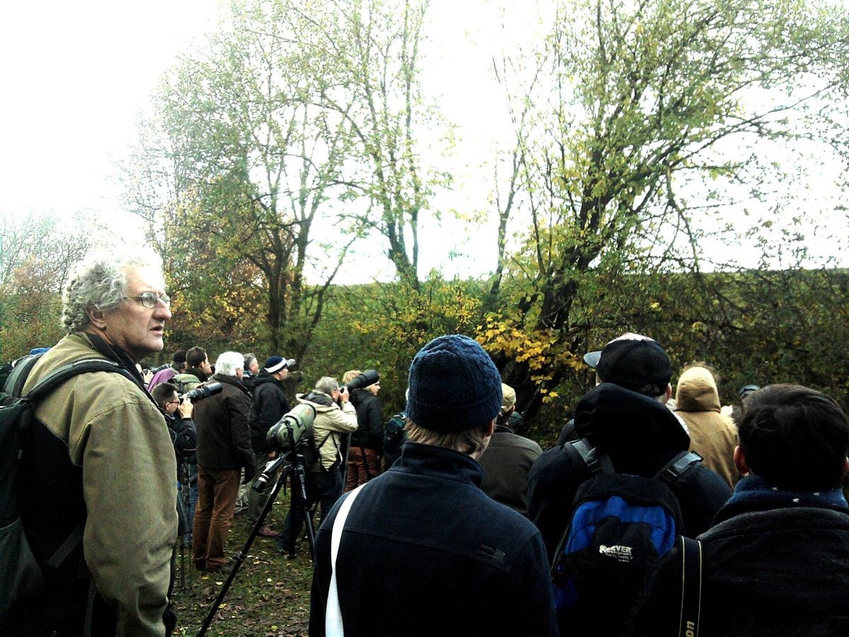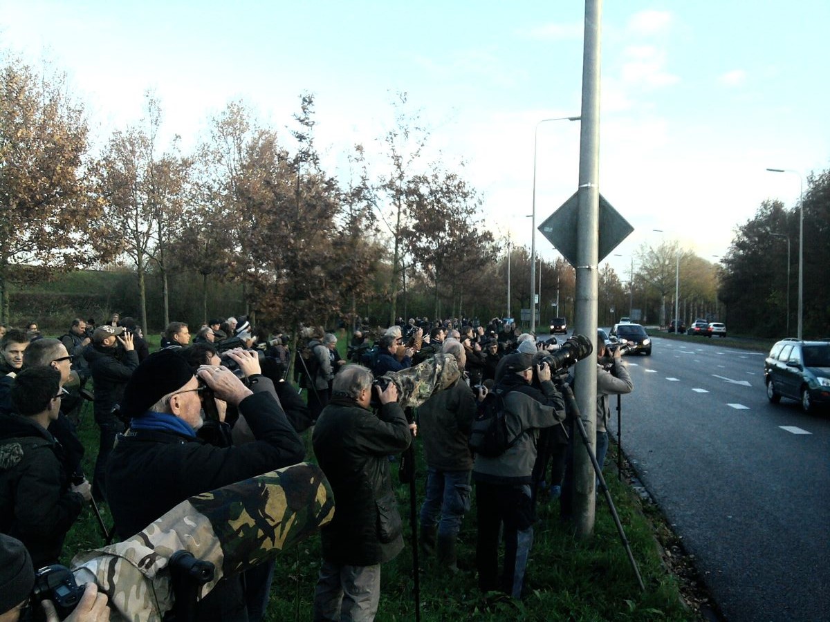 Wat een unieke gebeurtenis zo: 150 tot 200 mensen langs een drukke weg in Zwolle, met allemaal als doel het zien van een vogel. Volwassen mannen, vrouwen, kinderen en ouderen. Mannen gekleed in hovenierspak, tuinbroek, regenpak, chique kantoorkleding of in groene of bruine Fjält Raven outdoorskleding. Een twitch zo druk als deze is toch weer een sociaal gebeuren waarbij ik veel bekende gezichten tegenkom. Onder andere Jurgen Rotteveel en Floris Moolenbeek tref ik aan tussen de menigte. En de Sperweruil, die trekt zich maar weinig aan van alle belangstelling. De vogel is geweldig te zien, poetsend, zittend en kijkt ons regelmatig aan met zijn strenge blik. Later vliegt de vogel een stukje en gaat nog enkele keren erg mooi vrij zitten in bomen. Fotografen grijpen hun kans en klikken er flink op los. Automobilisten rijden verbazend langs. Er staan zelfs verkeersregelaars om er voor te zorgen dat automobilisten niet plots uitstappen om te kijken wat er gaande is.