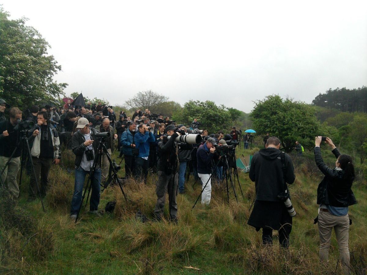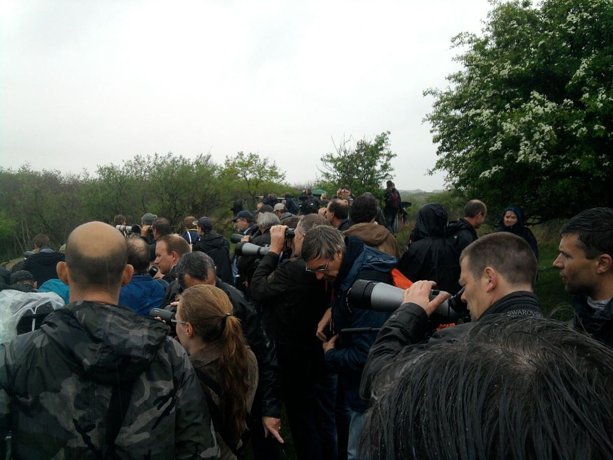 En dan is er paniek, grote paniek; “Vogel wordt door iemand weer gezien ergens in een Meidoorn, ter hoogte van een eikenboom die deels kaal is”. Een enkeling weet de vogel ook snel in beeld te krijgen, maar de meeste mensen vallen bijna neer van stress, waaronder ikzelf. “Waar precies? kan iedereen even stil zijn? Kunnen die klote paraplu’s weg?”. Als iedereen enigszins is bedaard geeft degene die de vogel nog steeds in beeld heeft enkele aanwijzingen waar te kijken. Nog meer spanning en stress maar ook vreugde zijn het gevolg. Steeds meer mensen weten de vogel in beeld te krijgen, maar ook veel mensen nog steeds niet. Gelukkig zijn veel vogelaars bereid hun telescoop met de Roodborstlijster in beeld ter beschikking te stellen voor vogelaars die de vogel maar niet in beeld weten te krijgen, waaronder ondergetekende. Nu is het genieten, de vogel is erg mooi te zien door een telescoop, prachtig (Bedankt Willem Wind)! Na enkele minuten galmt er een golf van opluchting door de grote groep vogelaars. Opluchting gevolgd door vreugdedansjes, felicitaties en breed lachende gezichten. Mensen springen van geluk en geven elkaar schouderklopjes. Wat een prachtmoment, wat een sociaal gebeuren! Ruim 150 vogelaars staan op de middag van 27 april 2014 op een hoog duin, doorweekt in de regen, met een bevredigde blik naar een nieuwe soort voor Nederland te kijken. De ene dicht gewikkeld in regenpak, de andere gekleed in slechts sandalen, korte broek en t-shirt.