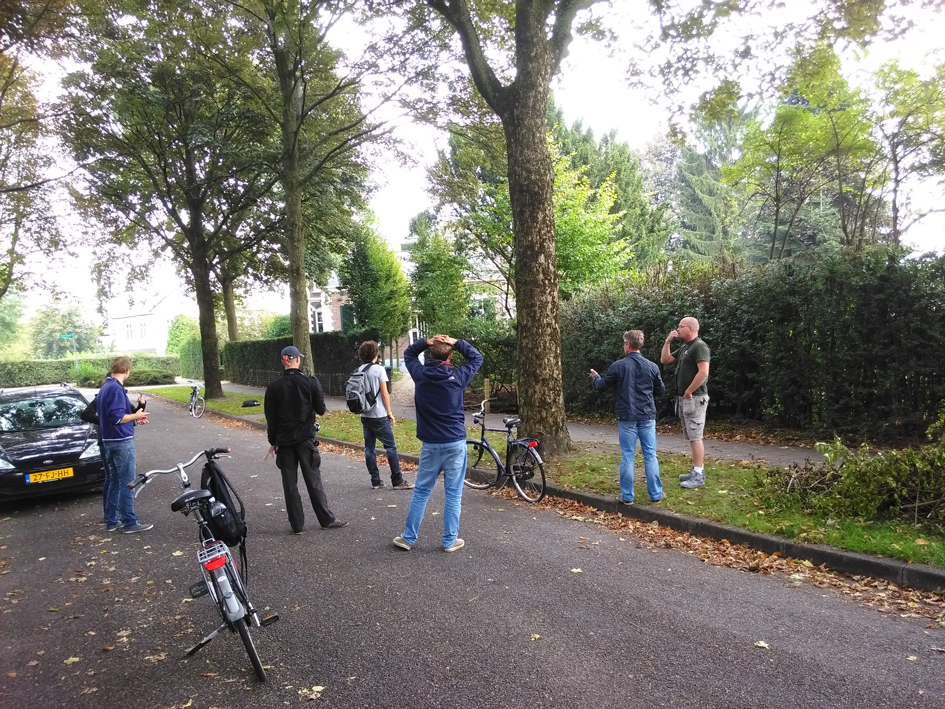 Enfin, bij aankomst op de Gravin Adalaan, waar de vogel voor het laatst is gesignaleerd, staat een handvol vogelaars, waaronder Matthias zelf. Daarnaast ook andere bekende gezichten. De tuinen van de Zuider Parallelweg en Gravin Adalaan zijn rijk aan struiken en bomen zoals Kastanjes, Sparren en Esdoorns, ideale omstandigheden voor een Bladkoning om zich goed te verstoppen. De omstandigheden om het voor vogelaars lekker spannend te maken. Totdat het beestje roept, en het erop lijkt dat de vogel ergens verderop in een achtertuin bevindt. De groep vogelaars, waaronder ikzelf, verplaatsen zich naar de achtertuin van het studentenhuis waar Matthias woont.