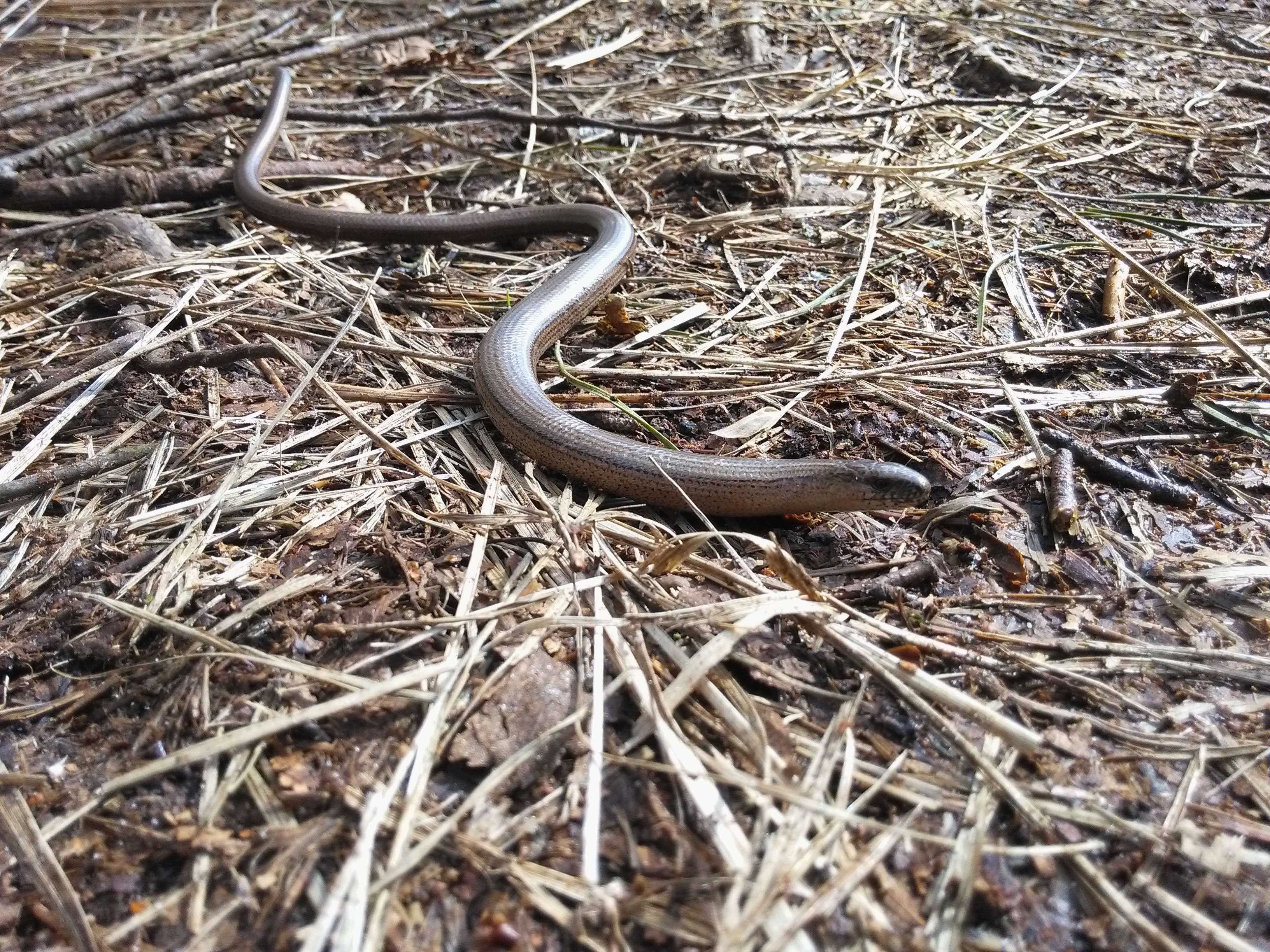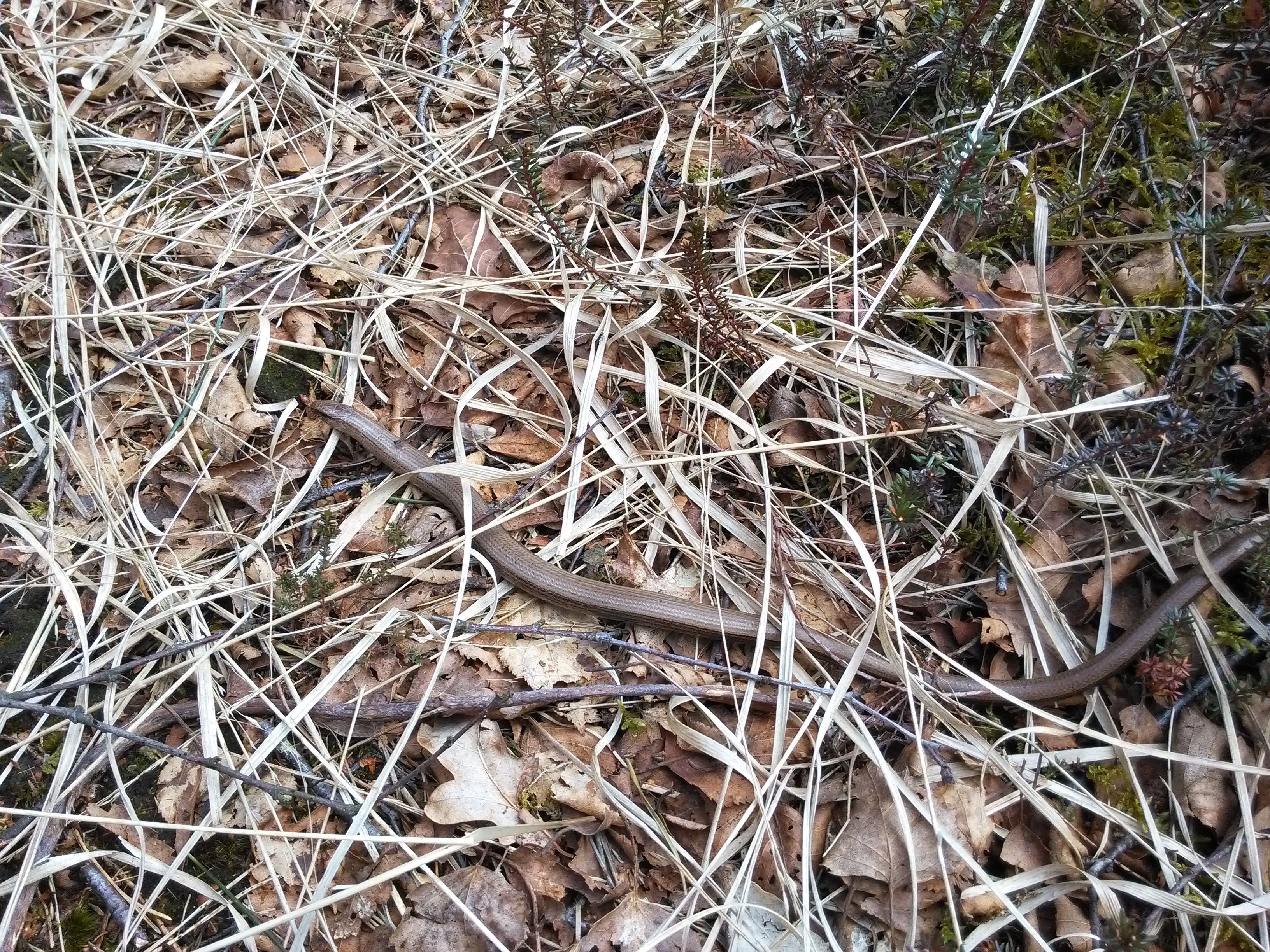 Als ik dan even later weer naar de grond kijk, zie ik plotseling tussen de heidevegetatie een koperkleurig, slangachtig diertje liggen. “Het zal toch niet”, denk ik bij mezelf. Maar hij ligt er toch echt, een prachtig mannetje Hazelworm van ongeveer 30 cm geeft zich prijs aan mijn ogen, goed (maar niet goed genoeg) verstopt tussen de vegetatie. Ik kan bijna wel in de lucht springen van blijdschap. Dit vanwege het feit dat ik al in geen jaren meer een Hazelworm heb gezien in deze omgeving, en dan ook nog nooit eerder in dit terreintje, een erg leuke verassing!