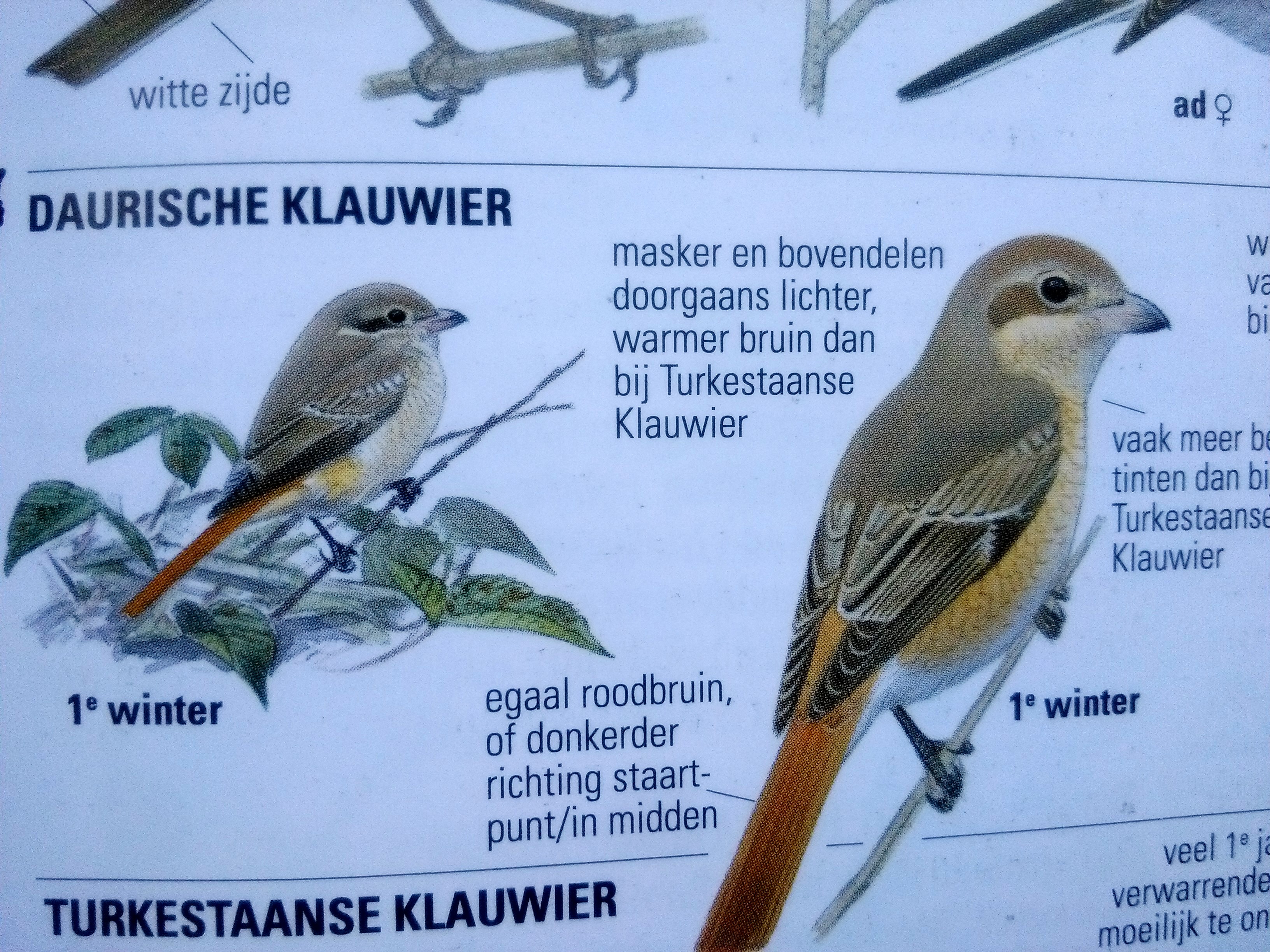 Ik besluit snel de ANWB vogelgids (‘Vogelaarsbijbel’) te raadplegen door informatie over de soort op te zoeken. Ik kom er zodoende al snel achter dat de Daurische Klauwier minder dan 10 keer is vastgesteld in Nederland, da’s toch behoorlijk zeldzaam. “Oké vooruit dan maar, ik ga mee naar Den Helder”. Een uurtje later staan Folkert Jan en Robert Pater bij mij op de stoep om mij op te pikken. Een halfuur later rijden we op de snelweg en vertrouwen we erop dat de vogel nog wel even blijft zitten.