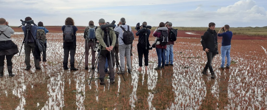 Terwijl honderden Bonte Strandlopers en andere steltlopers het wad sieren, lopen we richting de plek van de Roze Spreeuw. De vogel zit uiteraard tussen vele gewone Spreeuwen. Het is uitkijken naar een lichter exemplaar tussen de donkere gewone exemplaren. Aanvankelijk missen we de vogel, maar gelukkig komt het voor alle aanwezigen goed. De Roze Spreeuw laat zich nu en dan leuk bekijken, soms tussen het prachtige felrode zeekraal. De eerste zeldzaamheid van het weekend is binnen.