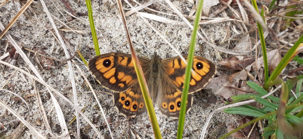 Na ook deze leuke soort te hebben binnen getikt, fietsen we weer langzaam vogelend terug naar Lange Paal. rondom het Posthuis vliegen enkele Boerenzwaluwen, hier een Tapuit, daar een Tapuit, nog wat Grote Gele Kwikken over ons heen. Er doet zich ook nog een leuk onverwacht hoogtepunt voor in de vorm van een vlinder. Een prachtige Argusvlinder.