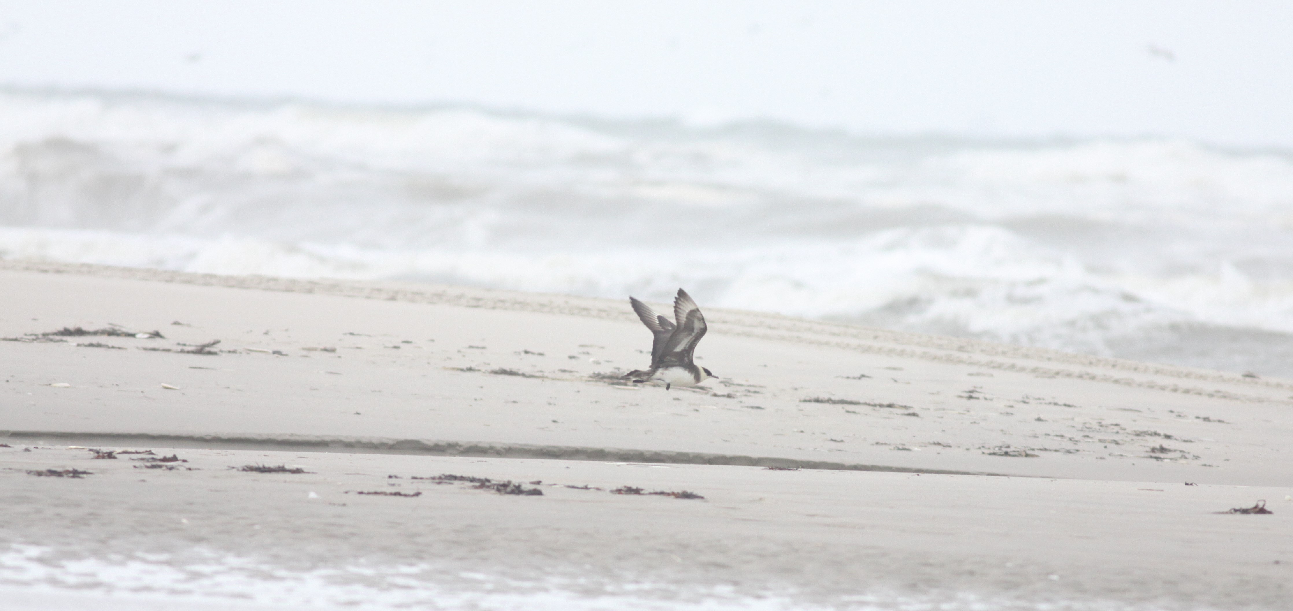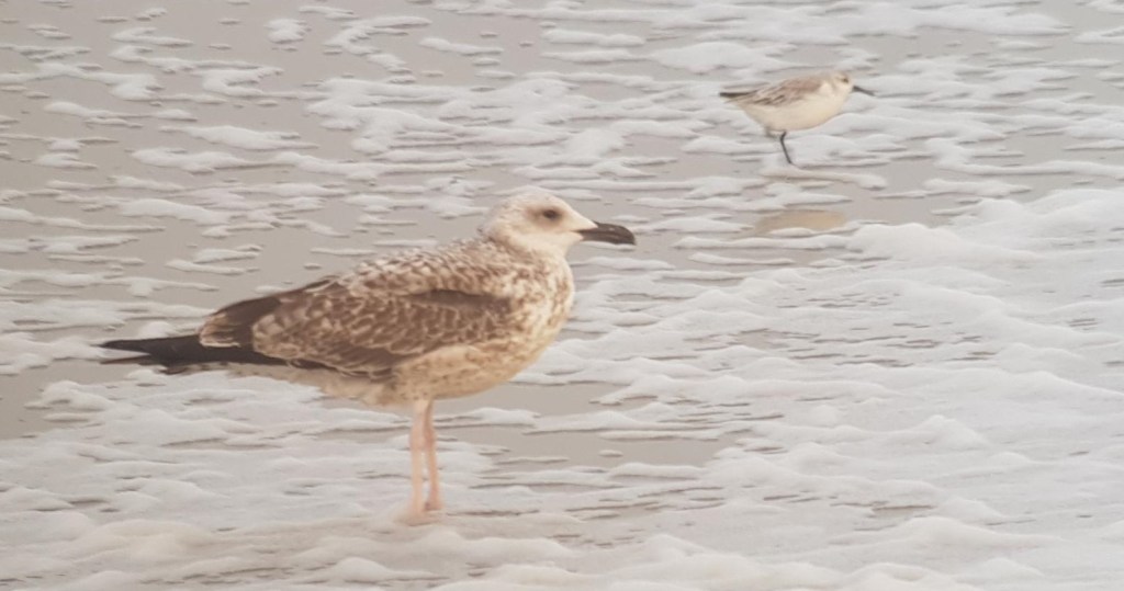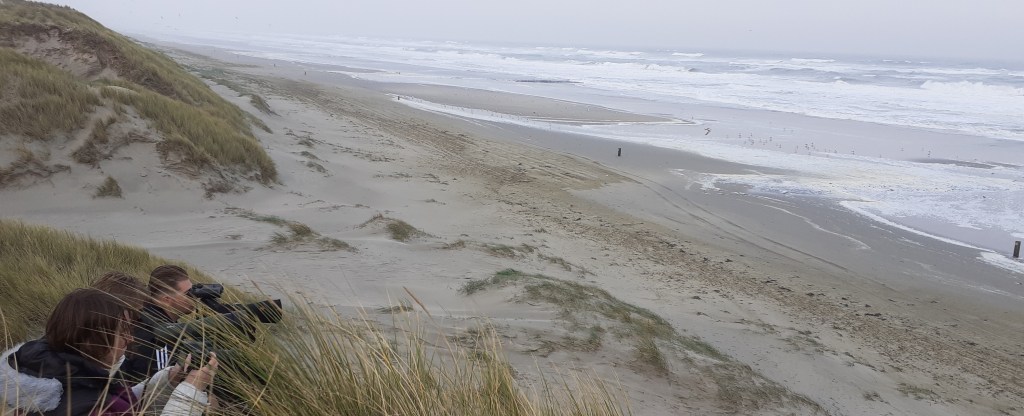 We zoeken een stabiele plek tussen de duinen en meteen is het raak. Een fraaie Kleine Jager ter plaatse op het strand. Grote Sterns blijven min of meer komen, foeragerende Drieteenmeeuwen en Grote Mantelmeeuwen, nu en dan een Roodkeelduiker langs, meerdere Jan-van-genten, Zwarte Zee-eenden, Geelpootmeeuw ter plaatse. Folkert Jan ziet waarschijnlijk in de verte twee foeragerende Grauwe Pijlstormvogels. Tijdens het aan zee zitten krijgen we een paar buien over ons heen. We waren voorbereid.
