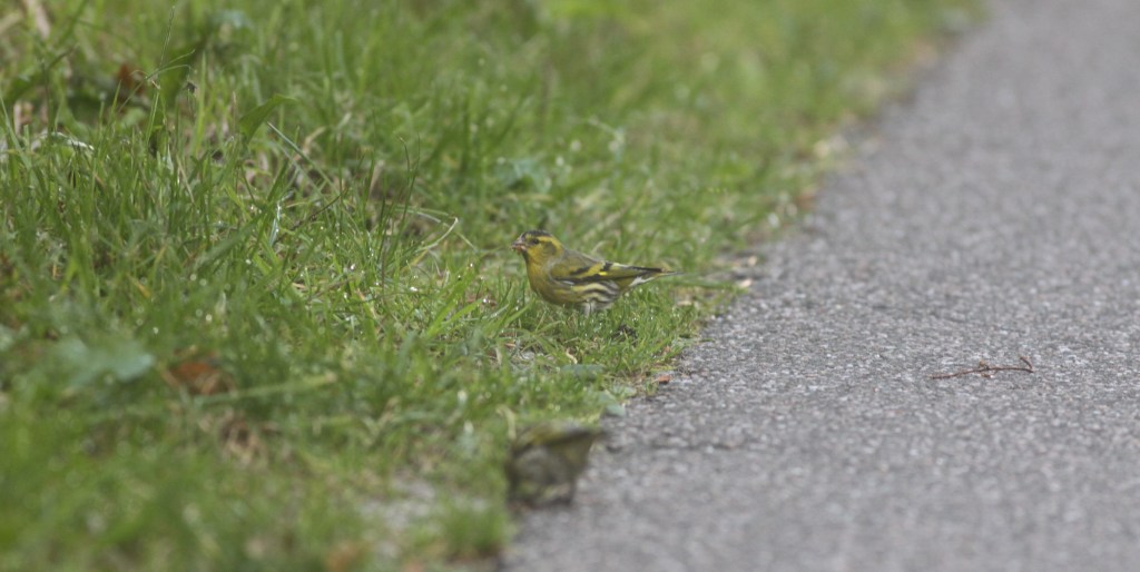 Het is heerlijk weer om te vogelen, nagenoeg windstil en droog. Het is ook goed te merken aan de vogels. Er zit van alles op het eiland en er vliegt steeds van alles over. In de DT1 appgroep is het nu al drukker met meldingen dan de dag ervoor. Spannend vogelen. Verderop in Bomenland langs de weg laten Sijzen en een Vuurgoudhaan zich leuk bekijken. Als we onze fiets parkeren bij de ingang van de Kroonspolders krijgen we te horen dat de Sperwergrasmus lastig is, onvindbaar.