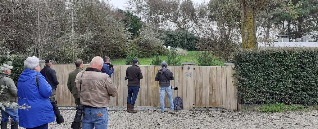 Al snel arriveren we op de parkeerplaats nabij de plek van ontdekking. Snel lopen, sprintje trekken, snel lopen, sprintje trekken, en al gauw zien we een groepje vogelaars naar een tuin staren. We schuiven snel aan en krijgen te horen dat de vogel kort geleden nog even is gezien maar nu uit beeld is. De spanning en adrenalinepeil stijgen weer in rap tempo. De spanning is haast niet te snijden. Zal de vogel zich dadelijk mooi laten bekijken in de tuin?