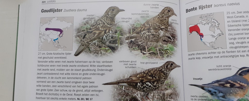 Op de donderdagavond van 1 oktober zit ik in alle rust in één van mijn vogelboeken te bladeren. In het boek ‘zeldzame vogels van Europa’ kan ik zoals wel vaker gebeurt, weer eens niet de verleiding weerstaan om even Goudlijster op te zoeken. Eigenlijk wel één van de mooiste vogelsoorten die je in Nederland kunt tegenkomen. Helaas bezoekt deze prachtige lijster uit het verre oosten zelden de lage landen.