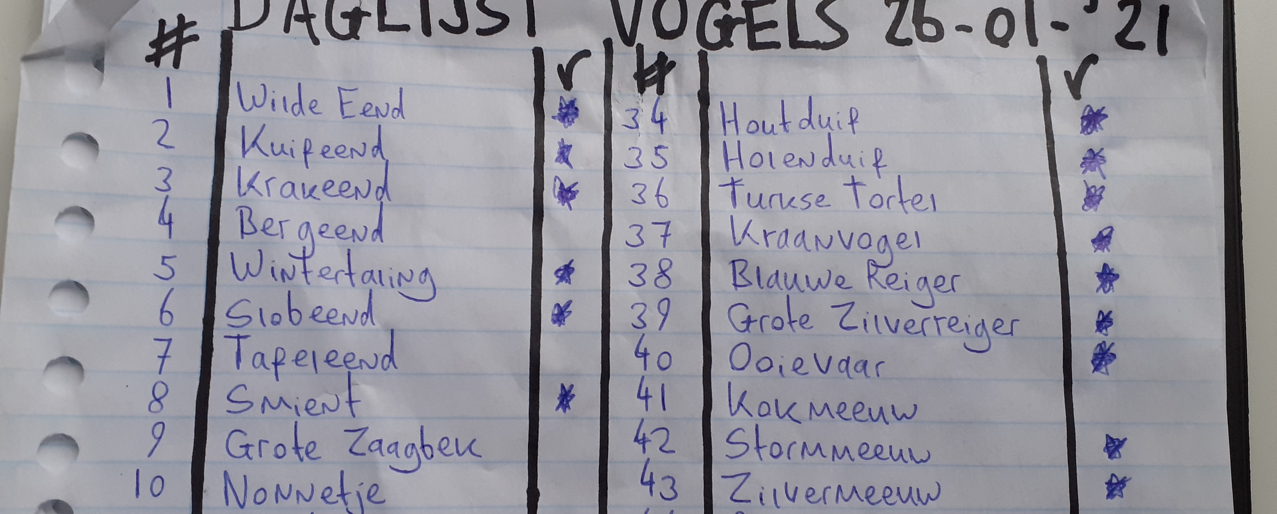 De klok gaat inmiddels langzaam richting 16:00 en ik ben best moe. Ik zoek nog even naar Houtsnip, maar deze soort laat zich vandaag niet zien. Ik besluit maar weer richting huis te gaan in de hoop dat ik in Veenhuizen nog een Zanglijster of Kokmeeuw zie. Maar de koek is toch echt op voor vandaag, het is mooi geweest. 88 soorten op een dag eind januari is een mooie score. Het was een mooie lange fiets- en wandeltocht door een schitterend stukje Nederland met prachtige soorten. Het was een lange dag met geluksmomenten en onverwachte wendingen. Hieronder nog een overzicht van bonussoorten (lastige soorten, of soorten waar ik niet op had gerekend) en de grootste missers van de dag.