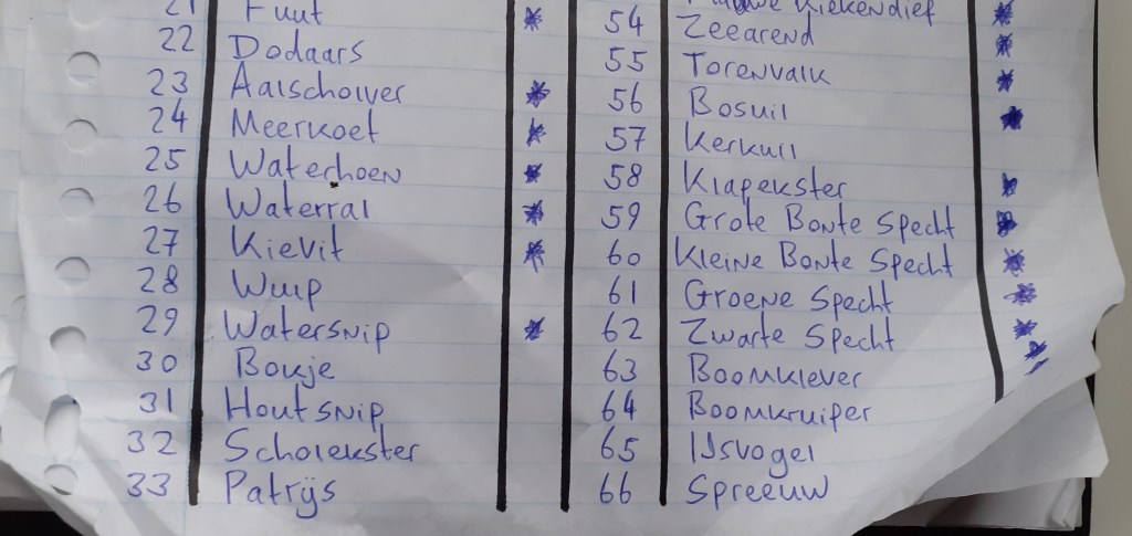 Ik heb een lijst opgesteld met daarop ongeveer 105 doelsoorten. Het betreft soorten waarvan ik weet dat ik ze gegarandeerd tegenkom, maar ook soorten waarvan ik weet dat ze lastig zullen zijn. Ik verwacht ook, zoals meestal met een big day het geval is, soorten tegen te komen die je niet verwacht. De zogenaamde bonussoorten.