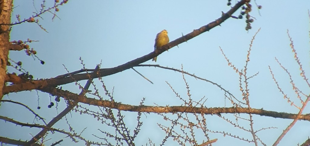 Vanuit Veenhuizen fiets ik vervolgens naar het meest noordwestelijk stukje Fochteloërveen, waar Bankenbos begint. Ik stop eerst even bij één van de sluizen bij Bankenbos, in de hoop op het paartje Grote Gele Kwikstaart dat hier vaak zit, zo ook gister nog. Nu zitten ze er helaas niet, en ook bij de sluis een stukje verder richting het westen, zitten ze dit keer niet. Zul je altijd weer zien, dat ze er net niet zitten wanneer je er zo op hoopt. Maar geen paniek, ik had de soort de afgelopen week op meerdere plekken in Bankenbos. Tijdens een korte stop op een open plek in Bankenbos met heide, hoor ik een reeks leuke soorten: een groep Kolganzen vliegt roepend over, maar ook Fitis en Boompieper laten net als de dag ervoor van zich horen. Een stuk verderop in Bankenbos een Raaf overvliegend en bij een wat kleiner sluisje middenin het bos alsnog de gehoopte Grote Gele Kwikstaart. Verder wat mezensoorten die hier steevast goed te doen zijn. Kruisbekken laten het vooralsnog afweten.