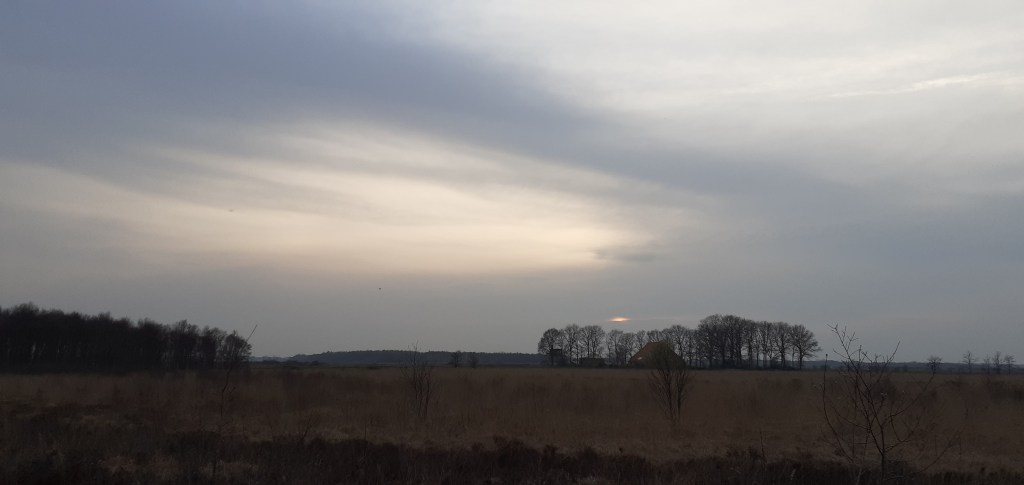 Inmiddels staat de teller al heel lang op 97 soorten, is ons geluk op? we denken van niet en gaan rustig door. De 100 soorten aantikken moet toch lukken, daar zijn we van overtuigd. Ook al wordt het flink sprokkelen en extra moeite doen voor nieuwe soorten. Rond 19:30 lopen we het lange fietspad op dat dwars door het Fochteloërveen loopt. Vanaf het fietspad verwacht ik in ieder geval nog wel een Blauwe Kiekendief te zien. Deze soort zag ik de afgelopen tijd vaak vanaf het fietspad. Ook had ik zeer recent nog een Klapekster vanaf het fietspad. Daarnaast hebben me misschien geluk met een baltsende Watersnip, Tapuit en wie weet zit Paapje weer in het gebied. Ook Oeverzwaluw behoort nog tot de mogelijkheden. We zien nog een mooie groep overvliegende Kramsvogels, maar een Koperwiek zit er helaas niet tussen.