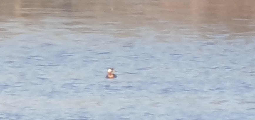 Dan op naar het Esmeer zelf, ik hoop hier op Zwarte Specht, Boomleeuwerik en misschien nog één of twee leuke eenden. Ook Fuut die ik hier laatst had zou moeten kunnen. Boomleeuwerik is ook een schaarse soort in het Fochteloërveen, maar de afgelopen week had ik meerdere keren een zingende vogel hier. Rondom het Esmeer is veel gekapt waardoor er kapvlaktes zijn ontstaan, voor sommige vogelsoorten een interessante biotoop. Ondertussen heb ik contact met Folkert Jan. De Amerikaanse Smient bij Leeuwarden werkte weer niet mee en hij is onderweg naar mij. Ik laat weten dat ik bij het Esmeer ben waar we elkaar zullen treffen. Ik sta nog een paar keer stil in het bos in de hoop op Kruisbek, maar tevergeefs. Boomleeuwerik werkt gelukkig wel mee en op het Esmeer zie ik een vrouwtje Brilduiker. Folkert Jan komt inmiddels aangelopen en we nemen door wat ik al waargenomen heb.