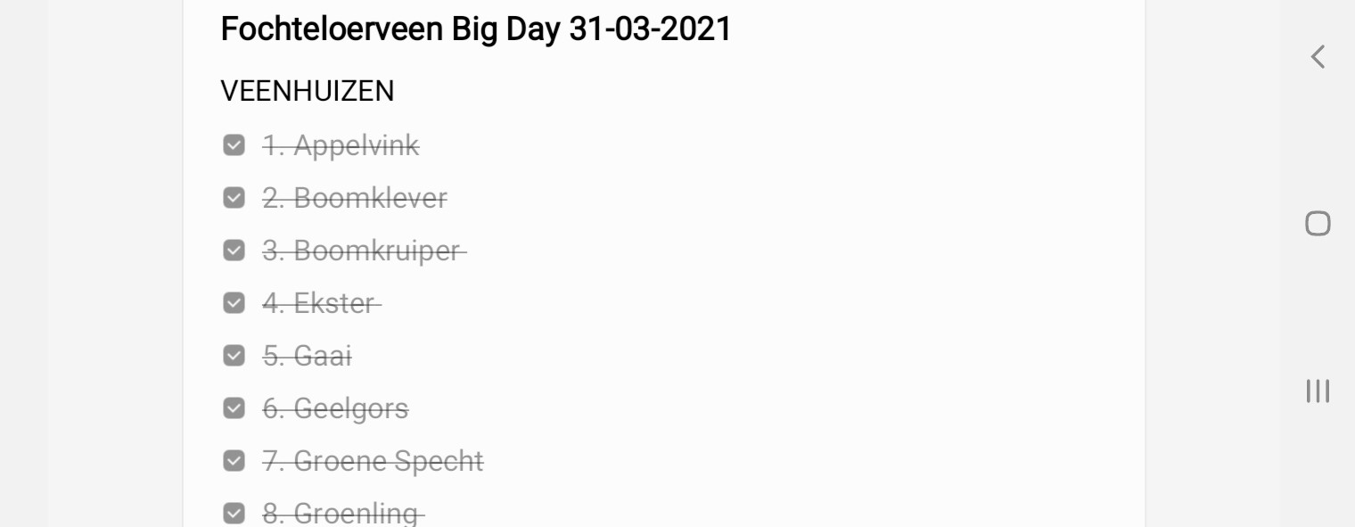 Ik hoor verder nog wat Smienten roepend overvliegen, maar geen nieuwe dagsoorten meer. Ik besluit dat het ook meer dan leuk is geweest voor vandaag. Het was weer een mooie en enerverende dag vogelen in het Fochteloërveen met maar liefst 102 soorten, een mooi aantal. Daarnaast ook nog wat leuke afleiding van een Koereiger bij Groningen. Op naar de volgende big day ergens in de tweede helft van april. Dan zal de soortensamenstelling weer anders zijn. Ik kijk er weer naar uit. Hieronder nog een opsomming van de grootste missers vandaag, maar ook bonussoorten.