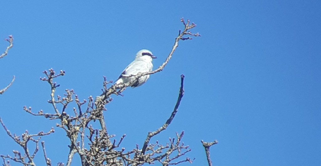 Het is weer tijd voor het Esmeer zelf, waar de kans groot is op weer een paar goeie soorten. Zo zit hier nog steeds een late Klapekster (misschien een overzomeraar?) en is het de enige plek in het Fochteloërveen waar Boomleeuwerik redelijk goed te doen is. De Klapekster krijg ik zowaar op een presenteerblaadje, vlak langs het wandelpad zit de vogel mooi in de top van een boom. De klauwier is mooi te volgen en jaagt af en toe op muizen en kleine vogels. Boomleeuwerik werkt ook weer prima mee en hier eindelijk ook de eerste Kneuen van de dag. Ook een zingende Veldleeuwerik hoog in het luchtruim en de enige Zilvermeeuw van de dag op trek.
