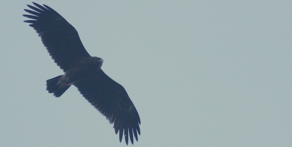Dat zou een teken kunnen zijn dat de hoofdrolspeler van vandaag nog in het bosje zit. We wachten voor we het weten een dik anderhalfuur, maar geen Schreeuwarend, zou de vogel van uitslapen houden? De kraaien zijn ook alweer rustig. Het bosje wordt in ieder geval vanuit alle hoeken in de gaten gehouden. Mocht de vogel er nog zitten, moet deze worden opgemerkt. Op een gegeven moment besluiten we in overleg met andere aanwezige vogelaars voorzichtig voor het bosje langs te lopen. Al snel ziet iemand de Schreeuwarend dan zitten in een boom. Op aanwijzingen zien anderen de vogel ook, ik en Folkert Jan zien nog niks. Kwestie van geduld, rustig blijven, dus trekken we ons weer terug. Het duurt even, maar al snel vliegt de vogel op uit het bosje en hangt boven de hoofden van tientallen blije vogelaars.