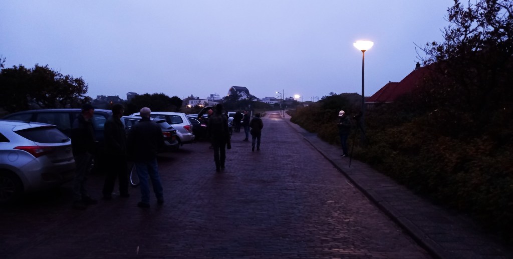 Om 06:30 gaat de wekker en sta ik op. dan even snel opfrissen. Als ik naar buiten loop om het ontbijtpakket op te halen valt het me op dat het een stuk warmer is dan gisteravond. Het regent ook een beetje. Het lukt me amper een hap door mijn keel te krijgen, een paar happen uit een bolletje en een klein beetje kwark lukt me met moeite. We aten ook pas laat op de avond gister. Maar de zenuwen zullen ook een rol hebben gespeeld. We pakken onze spullen, checken uit en zijn al snel onderweg naar de excursie-verzamelplek in Bergen aan Zee. Als we net Bergen aan Zee binnenrijden zie ik in het schijnsel van de koplampen meerdere Koperwieken en Merels midden op de weg zitten. Er lijkt sprake te zijn van een flinke trekgolf van lijsters. Veel vogels komen naar beneden vanwege de tegenwind en de regen waarschijnlijk, zijn op zoek naar beschutting na een lange trektocht. Als we 07:30 arriveren op de plek lijken we de eersten te zijn. Maar al snel zien we nog iemand rondrijden en een minuut later arriveren nog enkele mensen. De eerste bekende die ik zie en even spreek in de vroege duisternis is Wietze Janse. We gaan vervolgens weer even naar de auto om wat spullen te pakken. Nog even afwachten en al snel zijn er enkele tientallen mensen aanwezig. Ondertussen vliegen er flinke aantallen Zanglijsters, Koperwieken en Merels over ons heen. De lucht is zwanger.