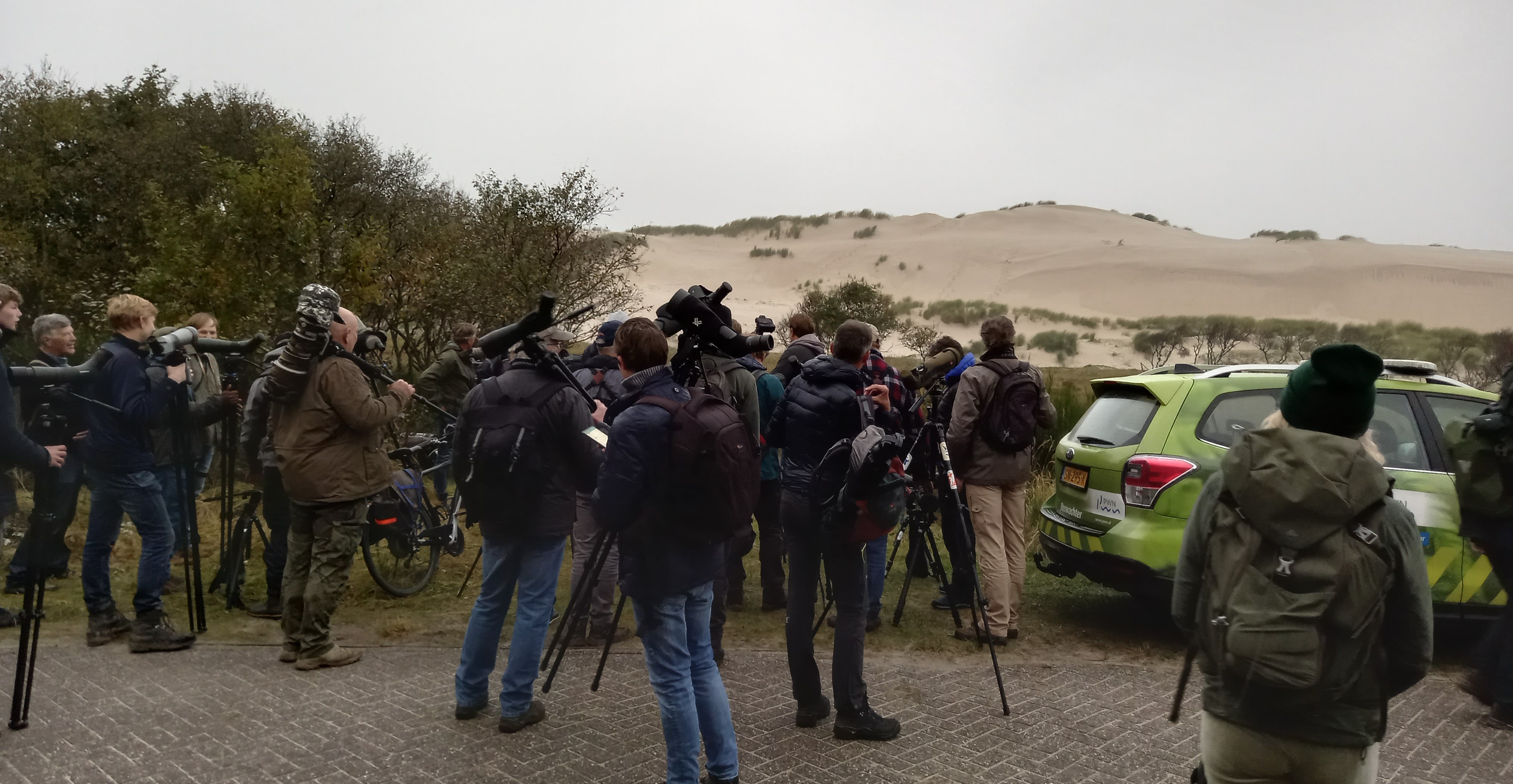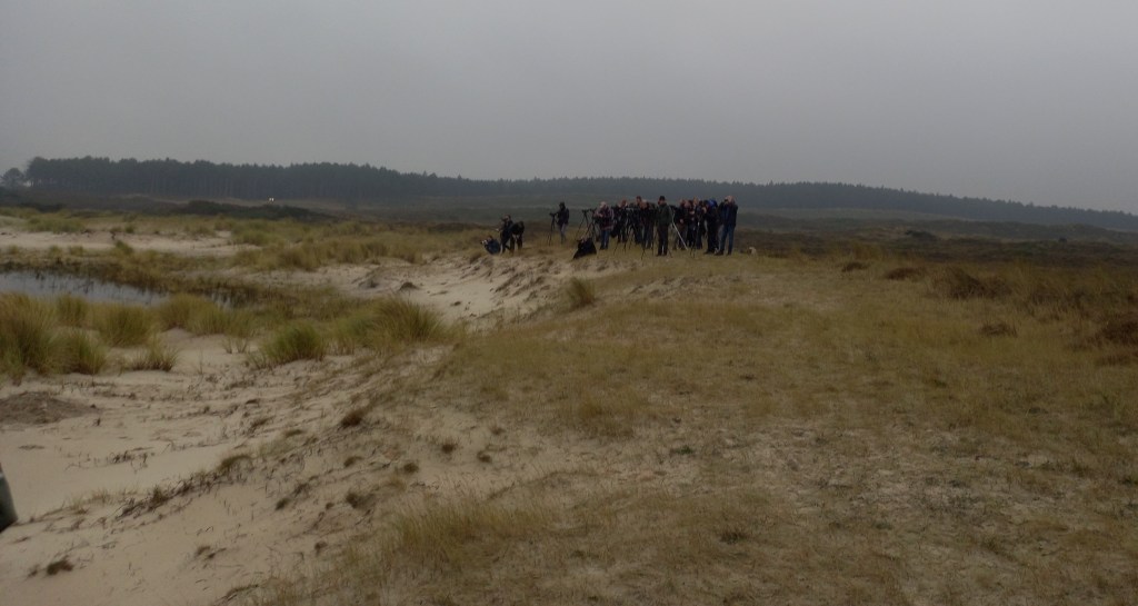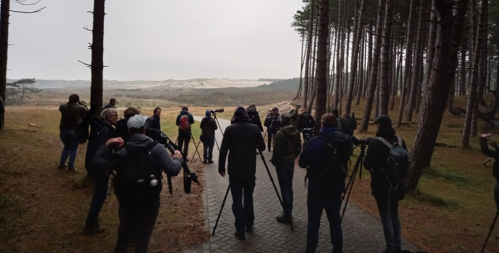 Siska zet de parkeerapp aan, ik koop toegangskaartjes voor het duingebied. Het begint inmiddels gezellig te worden met veel bekende gezichten. We wachten op wat komen gaat, informatie, boswachters en hopelijk goed nieuws. Er is afgesproken dat eerst de boswachters ter plekke gaan kijken of de Renvogel er nog zit. Indien dit het geval is, zullen er weer één of meerdere excursies georganiseerd worden. Het begint inmiddels licht te worden en 08:00 lopen we alvast richting de bosrand vanwaar we uitzicht hebben op de zandvlakte waar de Renvogel hopelijk de nacht heeft doorgebracht. Aan de bosrand is het wachten op de verlossende woorden van de boswachters die aan het kijken en zoeken zijn. Een Houtsnip zorgt even voor wat afleiding en het is iets harder gaan regenen. Dan lijken de boswachters enkele gebaren te maken, wat betekent dit? het lijkt goed nieuws te zijn maar er is nog onduidelijkheid. Er wordt gebeld, gesproken, enkele vage geruchten. Het is zenuwslopend, mijn hart bonkt in mijn keel.