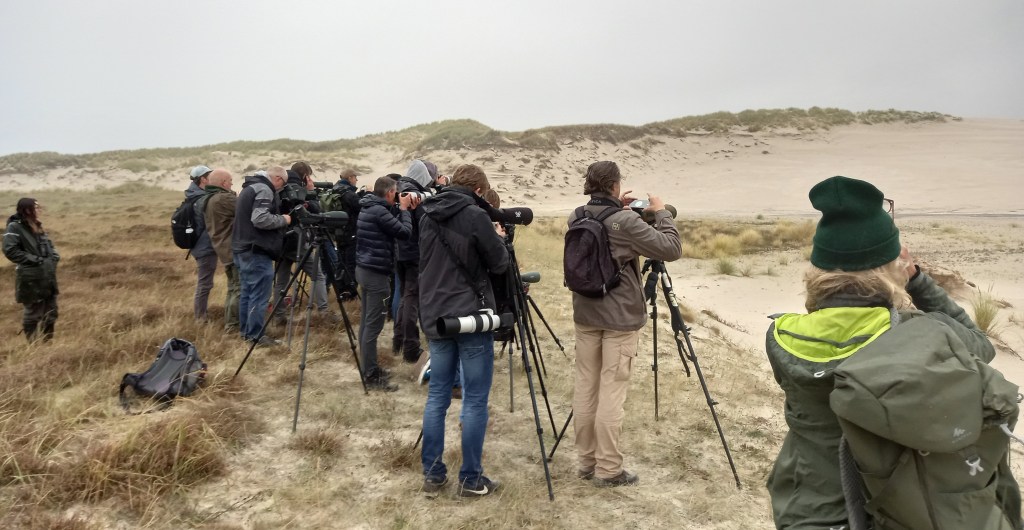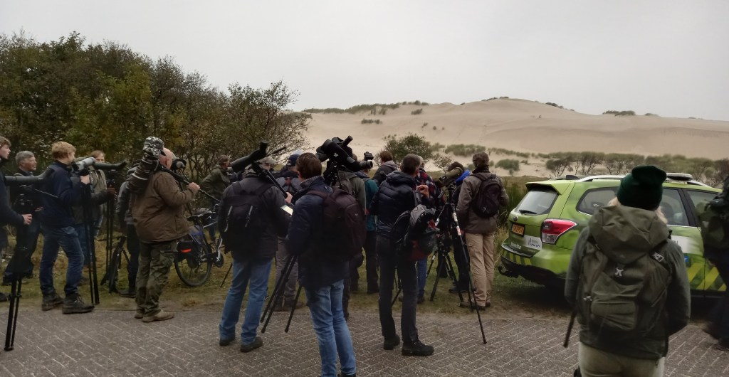 We besluiten eerst even iets te drinken bij de Tox Bar. Ondertussen kijk ik even snel op mijn telefoon of er nog iets zeldzaams is gevonden op Schiermonnikoog. In de Schiermonnikoog-app is het rustig, maar in de zeldzaamheden- en natuurvorsers app niet. Bij het lezen van de berichten kan ik mijn ogen nauwelijks geloven. Renvogel in Noord-Holland! lees ik dit nou goed? ja hoor, er staat toch echt Renvogel. Er staat ook bij dat er om 17:00 een excursie wordt geregeld. De vogel zit namelijk in voor publiek niet toegankelijk terrein. Wat nu? we zitten op Schiermonnikoog en kunnen eigenlijk geen kant op. Een gevoel van machteloosheid en enorme stress en frustratie overvalt me. De eerste Renvogel in 35 jaar tijd in Nederland en ik zit vast op een eiland. Ergens was ik al bang voor een scenario als deze, maar ja. Het blijft spannend in oktober. Ook dit jaar is dat niet anders. Op Vlieland zitten tientallen lotgenoten vanwege het DT3 weekend.