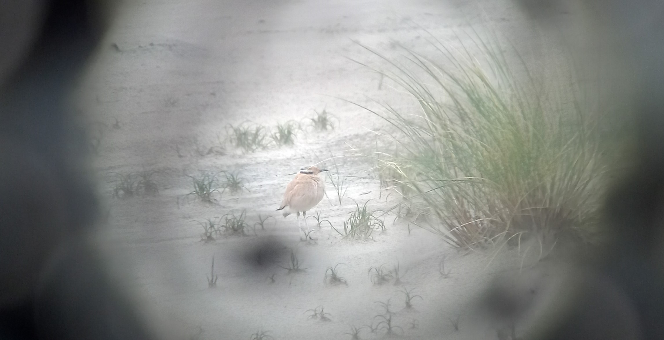 Dan om 08:37 toch eindelijk de verlossende woorden: ZIT ER NOG!! een enorme golf van opluchting is het gevolg. Ongeruste en angstige gezichten veranderen in glimlachende en opwekkende gezichten. Alsof men de vogel al met eigen ogen heeft gezien wordt er een klein feestje gehouden na het goede nieuws. Maar we moeten nog wel even een stukje lopen naar de plek waar een boswachter van PWN iedereen opwacht. Nog even stevig doorlopen en dan kunnen we hopelijk echt feest vieren, maar nu moet het wel goedkomen. Al snel staat de meute bij de boswachter te wachten op een teken dat we het gebied in mogen. Dit teken volgt snel en zo lopen we voorzichtig over het schrikdraad heen richting de plek. Iedereen blijft netjes op het smalle wandelpad, de sfeer is goed hoewel de spanning nog duidelijk af te lezen is van vele gezichten. Om 08:50 is het een kwestie van gezellig aanschuiven, nog even in spanning aanwijzingen volgen. Vogel zou net achter een graspol zitten, nu iets links van graspol, en in beeld!!!! HIEPERDEPIEP!!! Wat een geweldige verschijning zo op die mooie zandvlakte. Binnen enkele seconden maakt alle spanning, stress en frustratie van gister, vannacht en deze ochtend plaats voor een memorabel gevoel van euforie. Wat een intense ontlading en wat onwerkelijk. Zo’n vogelsoort van woestijnen zo vlak voor je neus, wat een droomsoort. De Renvogel zit mooi rustig ter plaatse, en dichtbij. Siska heeft de vogel ook snel in beeld en een flinke omhelzing volgt. Geluksvogels.