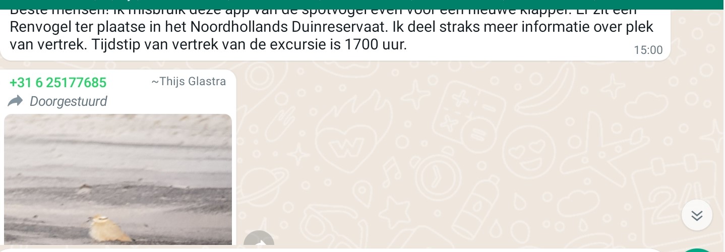 Het is alsof er opeens een flinke last van mijn schouders valt. Zo’n typisch moment waarop je weer even rustig wordt, je realistisch bent en je vastklampt aan hoop. Hopen dat de vogel er morgenochtend nog zit, maar ook dat de vogel de nacht overleeft. Het is niet niks, zo’n vogel van warme woestijnen nu opeens in een relatief koud Hollands duinlandschap. Wel bijzonder dat de vogel precies zo’n stukje Nederland uitzoekt dat lijkt op de Afrikaanse Sahara en woestijnen in het Midden-Oosten. Het is altijd koffiedik kijken of zo’n dwaalgast wel- of niet de nacht doorbrengt op de plek van ontdekking. Maar het feit dat de Renvogel van 1986 er ruim een week zat en later werd herontdekt, geeft hoop. Het weer ziet er ook niet optimaal uit vannacht om weg te trekken. Hoop is iets goeds, hoop doet leven. Onderweg naar Noord-Holland zeg ik tegen Siska dat ze gewoon rustig kan rijden, het licht begint al sterk af te nemen als we tussen Leeuwarden en de Afsluitdijk rijden. Ondertussen lees ik wat informatie over deze bijzondere ontdekking. De vogel is gevonden door boswachter Daan Bijman van PWN in het Noord-Hollands duinreservaat. Gefeliciteerd Daan, geweldig!