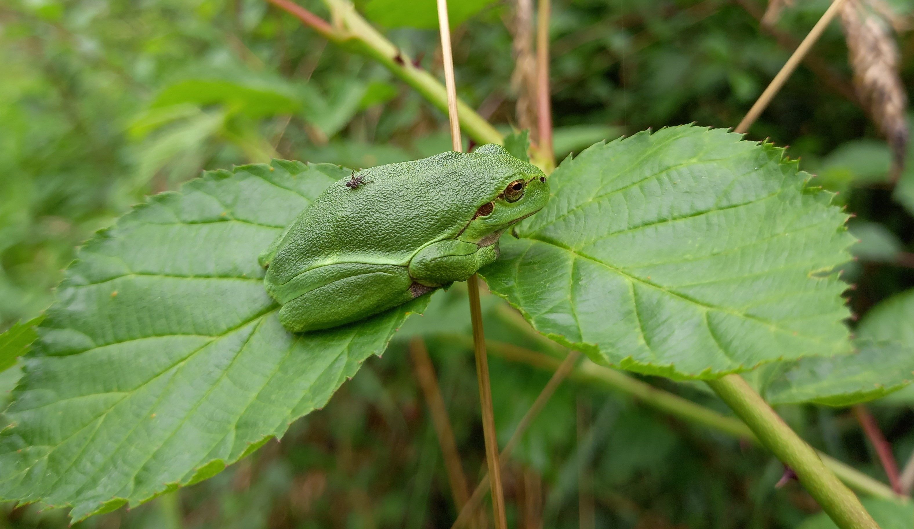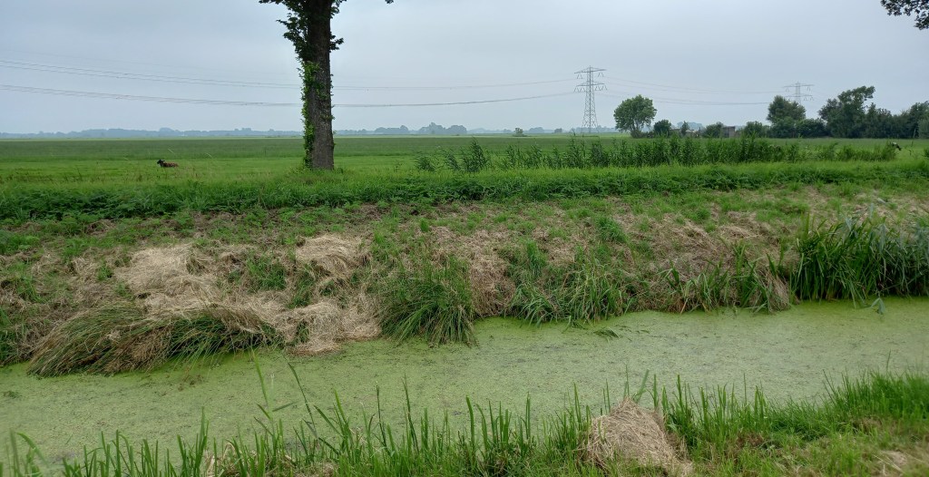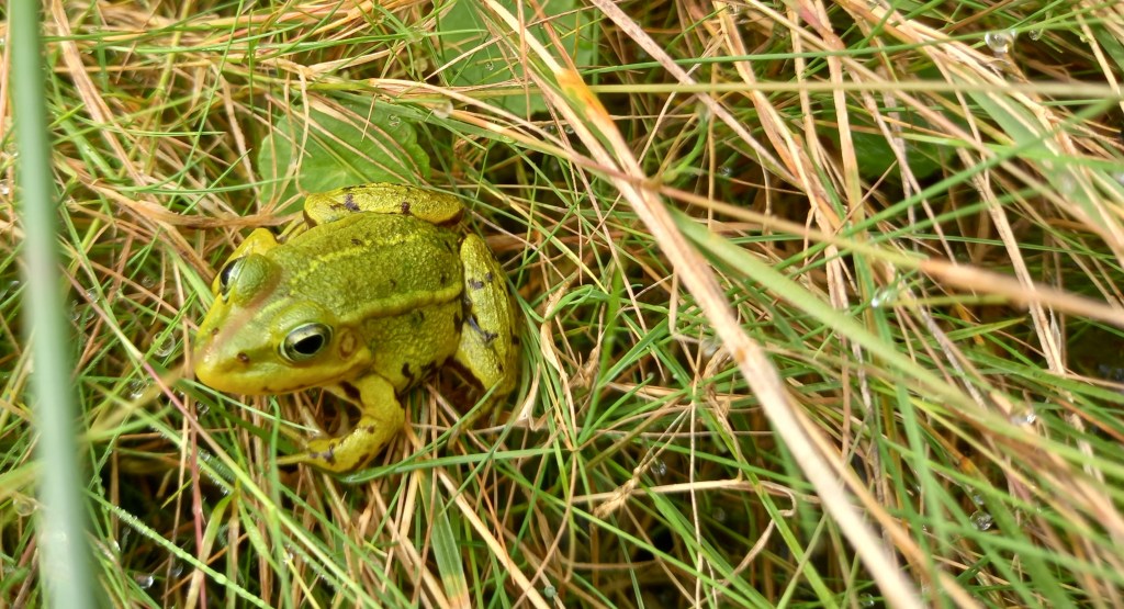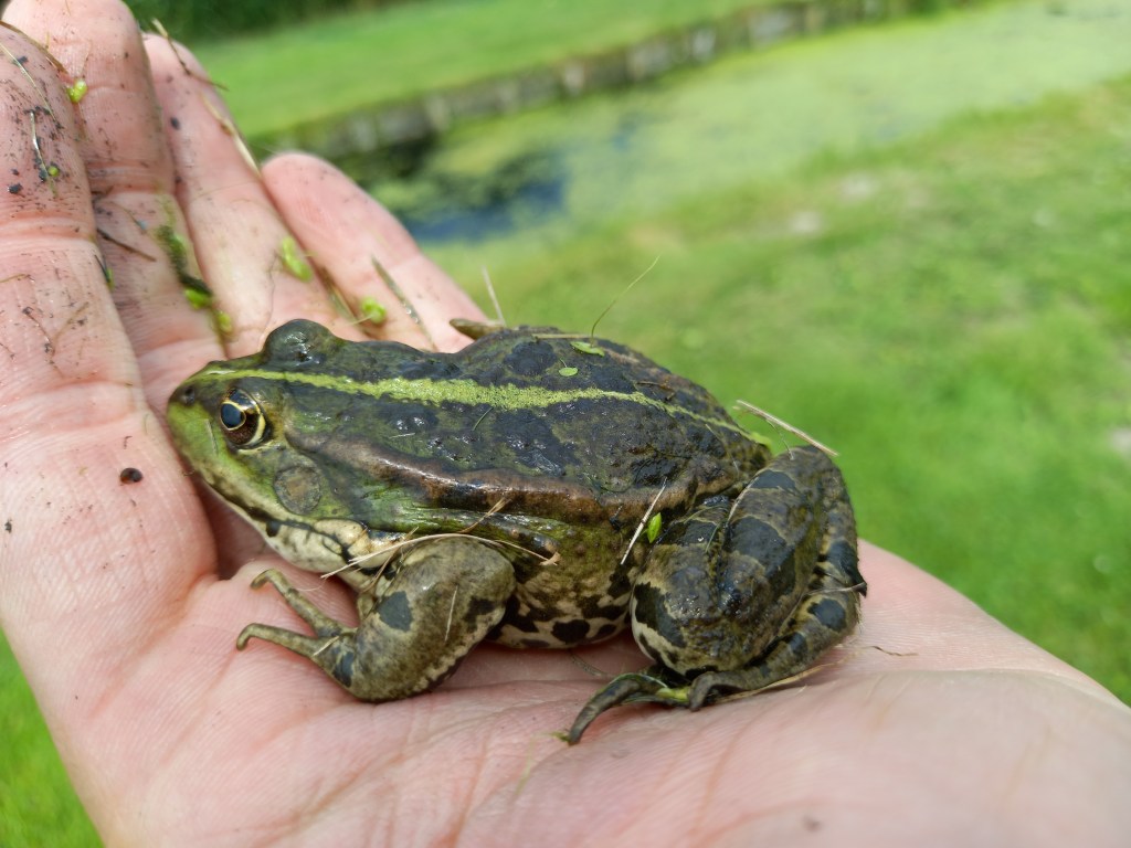 Op 13 juli ben ik de uitgestrekte weilanden ten westen van Grou (FR) in gegaan om op zoek te gaan naar Meerkikkers. Deze weilanden bestaan grotendeels uit sloten, poelen en er loopt een kanaal langs. Prima leefgebied voor deze grootste inheemse kikker (tot 15 cm). Het duurde niet lang of ik had al een handjevol exemplaren in het vizier. Op een gegeven moment had ik enkele honderden meters sloot afgezocht en werd me duidelijk dat Meerkikkers (en wellicht ook Bastaardkikkers) hier algemeen voorkomen.