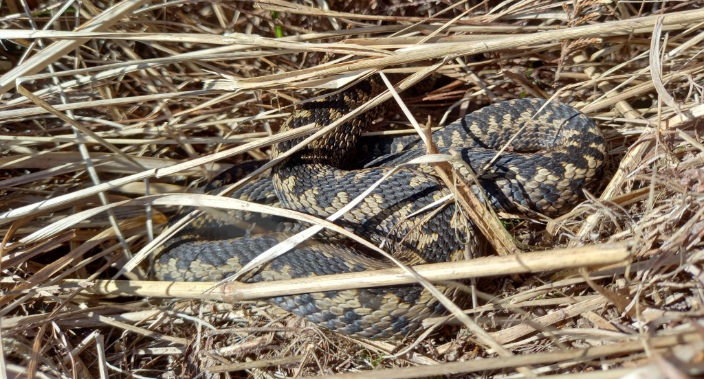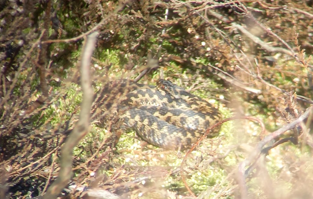 Op de zonnige middag van 23 februari ging ik voor het eerst dit jaar op zoek naar reptielen. Ik ging naar het heideveld waar ik vorig jaar de laatste Adders zag, het Balloërveld, in het land van de Drentsche Aa. al binnen een kwartier was het raak met een schuwe Levendbarende Hagedis. Al snel hierna een tweede exemplaar, deze liet zich beter bekijken. Dat is eigenlijk altijd een goed teken. Als er hagedissen actief zijn, liggen de eerste Adders ook in de vroege voorjaarszon. Dat was vandaag zoals verwacht inderdaad niet anders, al vrij snel zie ik een mooi adult mannetje op een helling liggen. Ik maak gauw door de verrekijker een bewijsplaatje. Ik maak een vreugdesdansje, een Adder zien blijft een gift van moeder natuur. De eerste van het jaar is extra leuk.