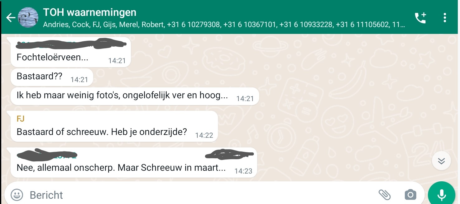 Op de foto lijkt een Bastaardarend te staan, maar nog een kleine slag om de arm. Een eventuele hybride is niet meteen uit te sluiten. Toen ik las dat de vogel zou zijn gezien in het Fochteloërveen gaf me dat een dubbel gevoel. Aan de ene kant was ik blij en opgewekt, aan de andere kant baalde ik een beetje dat ik op het bewuste moment niet in Veenhuizen zat. Dan had ik gelijk op de fiets kunnen springen het uitgestrekte veen in. Maar ik bleef positief en zat al gauw in de trein naar Assen. In alle hectiek stuurde ik per ongeluk een nietszeggend Ducht Bird Alert piepje de lucht in. Meteen krijg ik respons van Vincent Douwes die op dat moment in het Fochteloërveen is. Heeft de vogel nog niet gezien. Folkert Jan zit thuis te werken en heeft een overleg, en kan ook niet meteen ter plekke zijn.