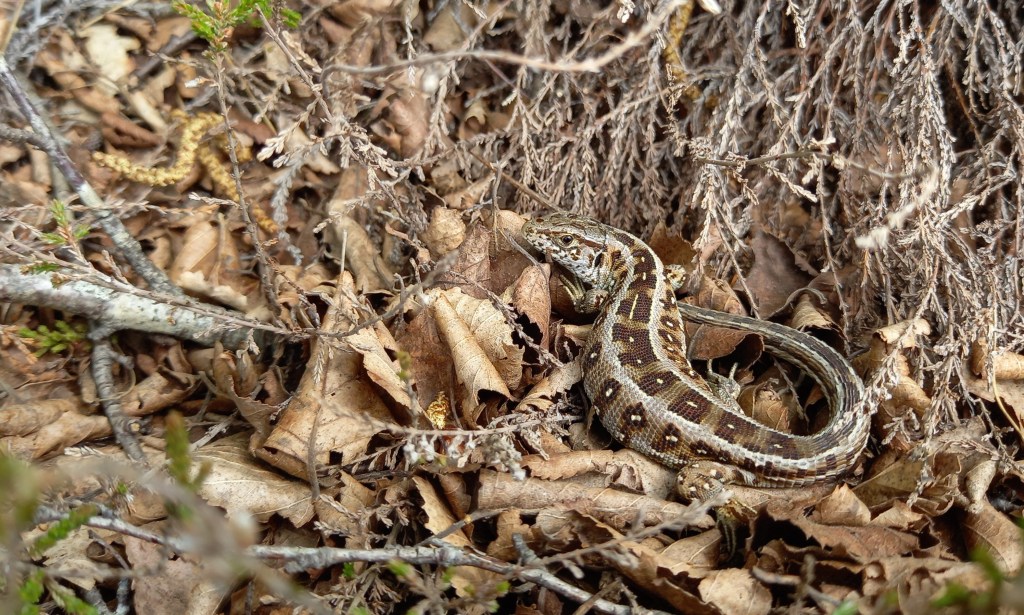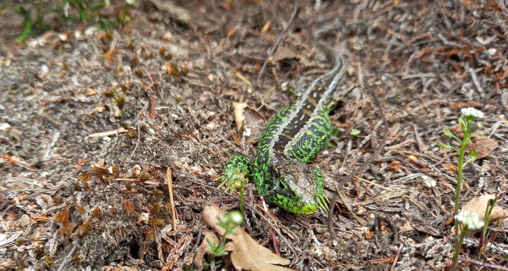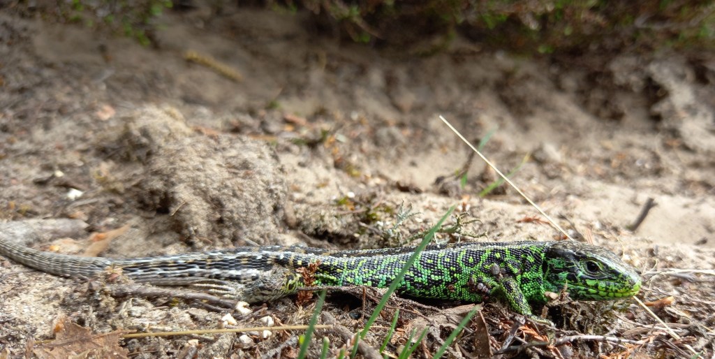 Op 5 en 6 mei was ik weer in Ede voor veldwerk. Op 5 mei maakte ik ’s middags een lange wandeling over de Ginkelse Heide in de hoop reptielen te zien. De Ginkelse Heide is een uitgestrekt heidegebied ten oosten van Ede. Het is een perfect leefgebied voor warmteminnende soorten zoals reptielen, sprinkhanen, zandbijen en vlinders. Ik zag weer mooie aantallen Zandhagedissen, waarvan sommige zich prachtig lieten bekijken.