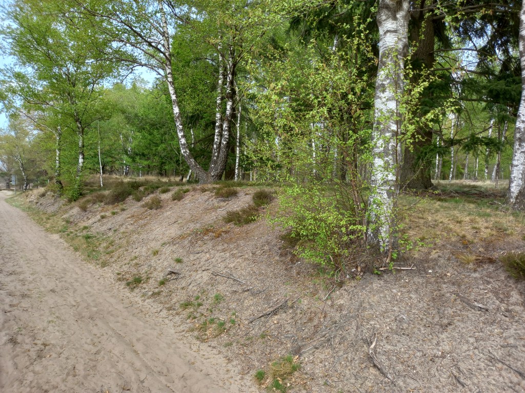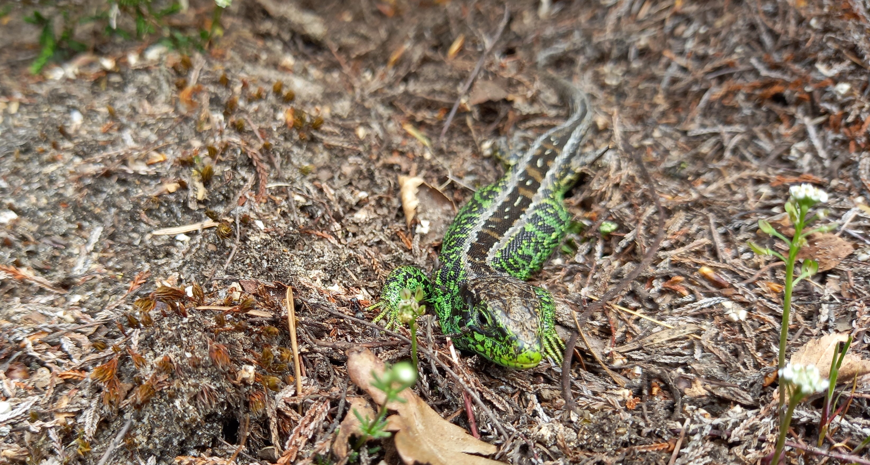 Op 5 mei kwam ik veel Zandhagedissen tegen langs de randen van de Ginkelse Heide. In het centrale deel van het gebied zag ik er geen. Het lijkt erop dat de reptielen meer voorkeur hebben voor de gradiënten (geleidelijke overgangen naar verschillende biotopen) in het gebied. Ik trof Zandhagedissen aan op open plekken en hellingen met her en der een plukje Struikhei, grassen, boompje en wat dood hout. In de nabijheid van deze plekken was voldoende open zand. Ik trof vooral mannetjes aan, maar ook enkele vrouwtjes. Op enkele jonge dieren (van vorig jaar) na, betroffen het allemaal volwassen dieren. De mannetjes vallen nu erg op vanwege hun felgroene paringskleed.