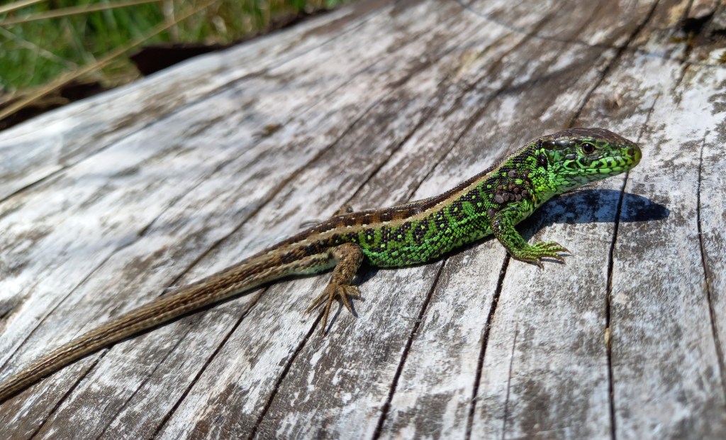 Op 6 mei zag ik nog enkele Zandhagedissen ten oosten van Ede, dit keer langs de spoorlijn Ede-Arnhem. Het betrof enkel mannetjes. Één exemplaar liet zich prachtig mooi bekijken en benaderen, terwijl ie zat te zonnebaden op een boomstronk. De mannetjes van de Zandhagedis zijn toch wel de mooiste inheemse reptielen wat mij betreft.