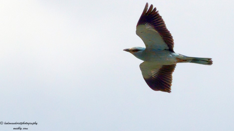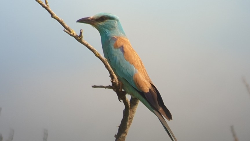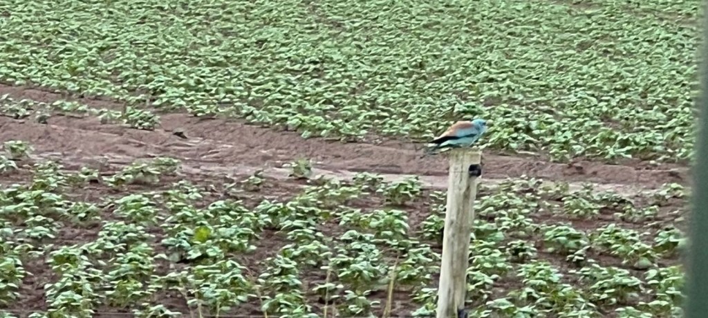 Al snel zien we de Scharrelaar prachtig langsvliegen. Een vreugdekreet en een slaak van opluchting onder vele tientallen vogelaars is het gevolg. Wat een heerlijke waarneming. De Scharrelaar vloog voorbij net zoals ik ‘m in mijn dromen al meerdere keren voorbij zag vliegen. Een felblauwe schoonheid met turkoois blauwe vleugels, bijna onwerkelijk, zo mooi. Bijna iedereen die de vogel tot dusver had gemist, heeft de vogel nu mooi kunnen zien. Even later vliegt de vogel weer over ons heen, weer richting de oude plek lijkt het.