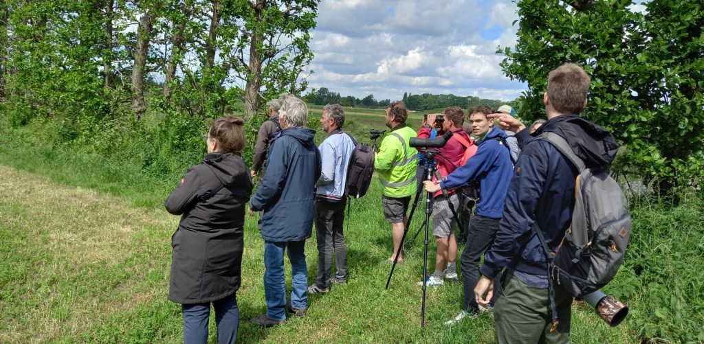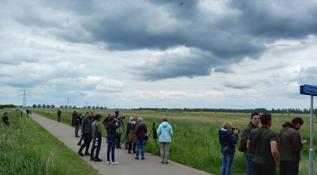 Een paar minuten later weer een melding dat de vogel weer vliegend is gezien. Dit zijn de berichten waar je op hoopt als de situatie er al een poosje niet hoopvol uitziet, je al een eind hebt gereden en bijna op de locatie bent gearriveerd. Het ‘piepje in de rug’ zoals vogelaars het ook noemen. 11:25 arriveren we op de plek waar de Scharrelaar net nog is gezien, maar nu even niet in beeld is. Ik kom veel bekende gezichten tegen, waaronder Pieter Doorn, Maartje en Tonny Bakker, Nelleke Seegers en Hans Bossenbroek. Enkele vogelaars hebben de vogel zojuist gezien, maar de meeste mensen kwamen net te laat.
