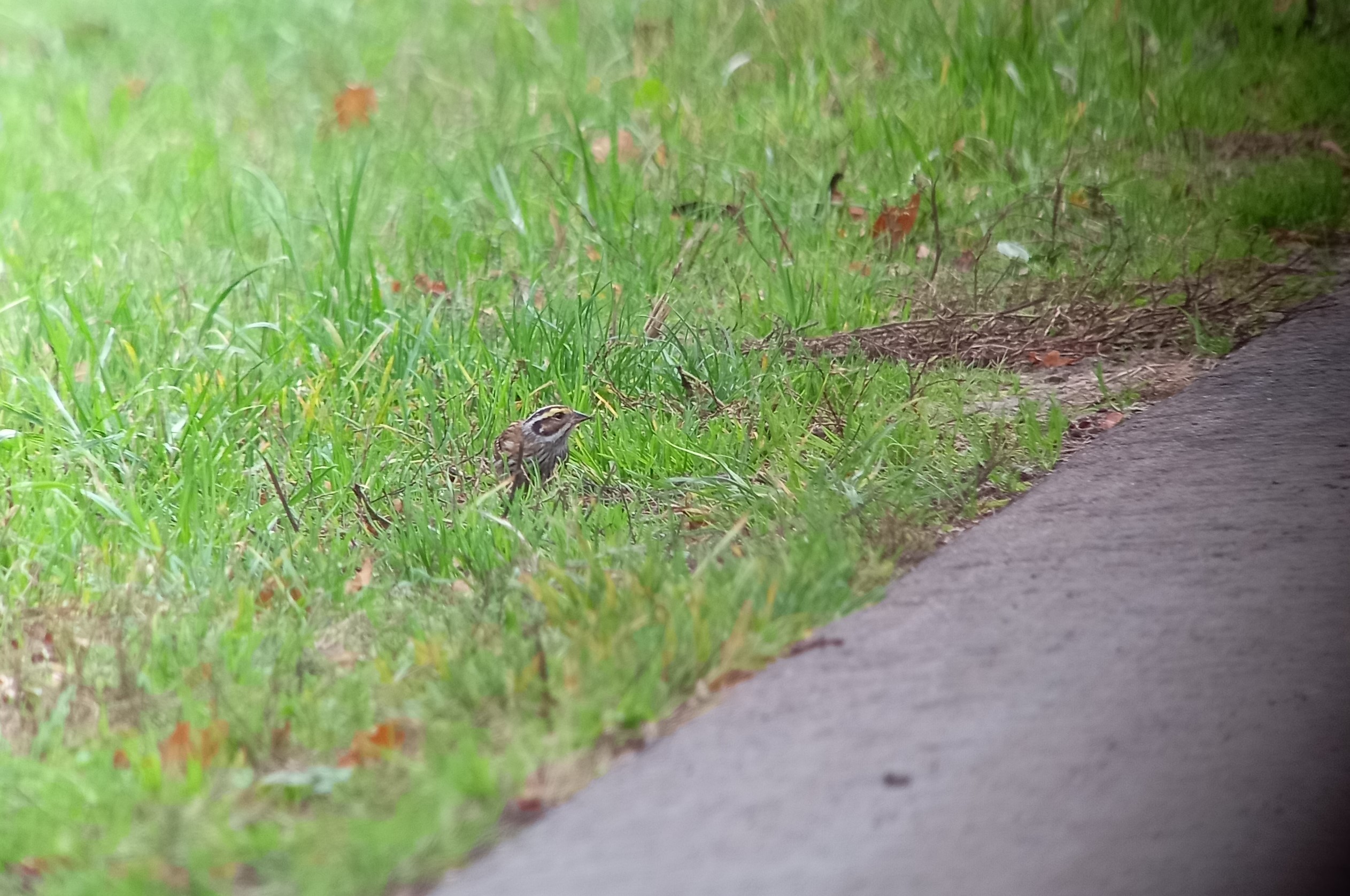 Folkert Jan stapt uit en met aanwijzingen probeer ik Folkert Jan duidelijk te maken waar ie moet kijken. Via de telefoon geef ik wat herkenningspunten door zoals: ‘ter hoogte van die overhangende smalle blaadjes”, vlakbij die bruine blaadjes in het gras” en “dicht langs het asfalt, net in het hoge gras”. En dan ziet ook Folkert Jan de vogel. Vol ongeloof dat de vogel zo dichtbij zit te foerageren. Ondertussen wordt het steeds drukker. Men blijft op gepaste afstand. Helaas passeert er regelmatig een fietser of landbouwvoertuig/vrachtwagen, daar kon je op wachten in zo’n landbouwgebied. Door deze passanten vliegt de Geelbrauwgors regelmatig op, maar komt uiteindelijk steeds weer terug naar dezelfde plek om te foerageren.