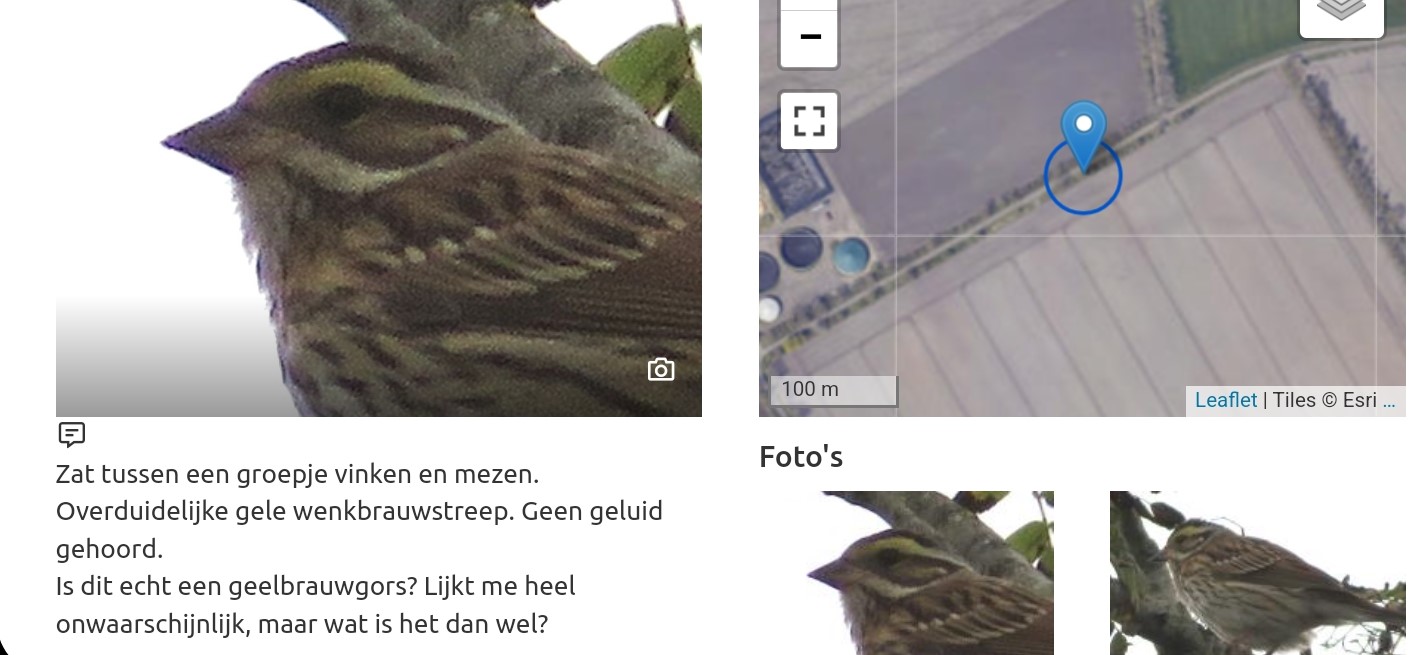 Vlak voor 16:30 wordt er via de zeldzaamheden-app een waarneming.nl link gedeeld met daarbij foto’s waarop een onmiskenbare Geelbrauwgors staat! wat een ongelofelijke soort! Ik pak nog voor de zekerheid even het boek ‘zeldzame vogels van Europa erbij’ om te kijken of het er echt één is (ik kon mijn ogen amper geloven). Één oogopslag is voldoende om het laatste beetje twijfel weg te nemen. Het is er echt één. Wat het nog leuker maakt, is het feit dat de waarneming in de kop van Drenthe is gedaan, bij het dorpje Bunne, vlakbij huis dus!