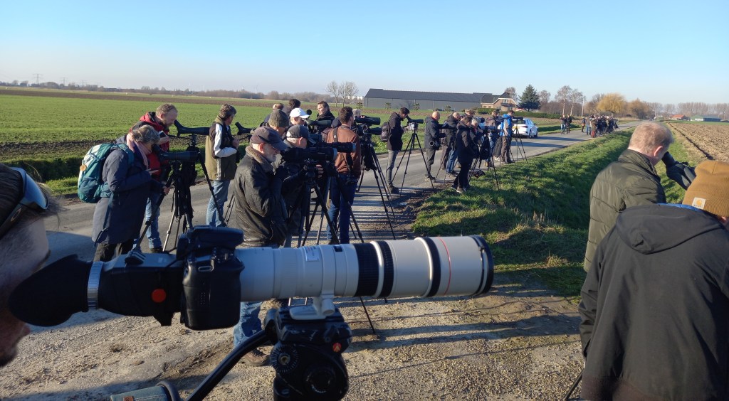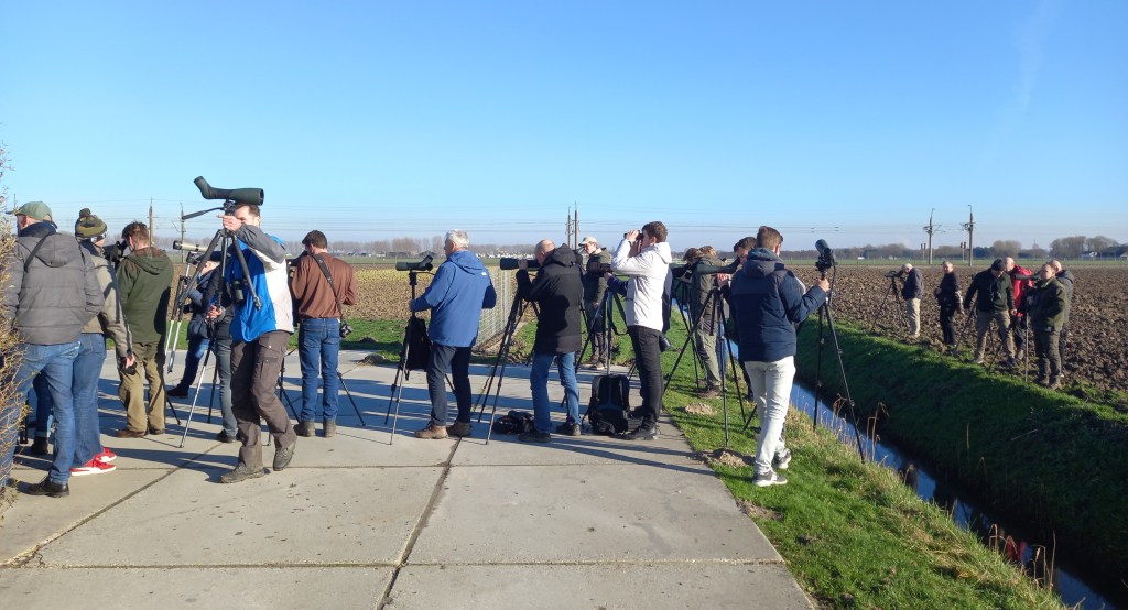 Rond 15:00 arriveren we op de plek, er staan al zeker een kleine 100 man de akkers af te speuren. We kunnen bij aankomst meteen even bij iemand door de telescoop kijken en hebben geluk, de vogel laat zich na een enigszine geduld zien. Wel zit de vogel vrij ver op de akkers, soms uit beeld achter zandhoopjes. Ook komen we de ontdekker Cornelis Fokker tegen die we feliciteren met zijn megaontdekking. Na al zijn veldonderzoek naar Waterpiepers (o.a. ringen en ringen aflezen) een zeer terechte beloning. De ultieme beloning na vele Waterpiepers te hebben bestudeerd. Een knappe ontdekking mag ook gezegd worden. De veldomstandigheden (ver en vaak uit beeld, beweeglijke vogel) in combinatie met een niet al te makkelijk te identificeren soort, doe het maar eens. Bedankt nogmaals Cornelis!