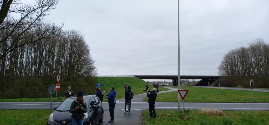 We lopen richting het viaduct waar de vogel het grootste gedeelte van de tijd rondhangt. Siska fietst ons ook al tegemoet, waarna we ons aansluiten bij een groepje vogelaars. De Alpengierzwaluw geeft op dat moment een ware vliegshow boven onze hoofden, het lijkt bijna onwerkelijk. Eindelijk deze lang gehoopte soort op het netvlies, en hoe…! De uit zuidelijke streken afkomstige vogel is vrijwel continu in beeld. Dan weer boven de bomen, dan weer boven het viaduct, soms een stukje richting het oosten en voor je het wist hing ie weer boven de hoofden van de dolgelukkige vogelaars. De vogel vliegt dusdanig dichtbij dat het zelfs mogelijk is om met de telefoon filmpjes en bewijsplaatjes te maken.