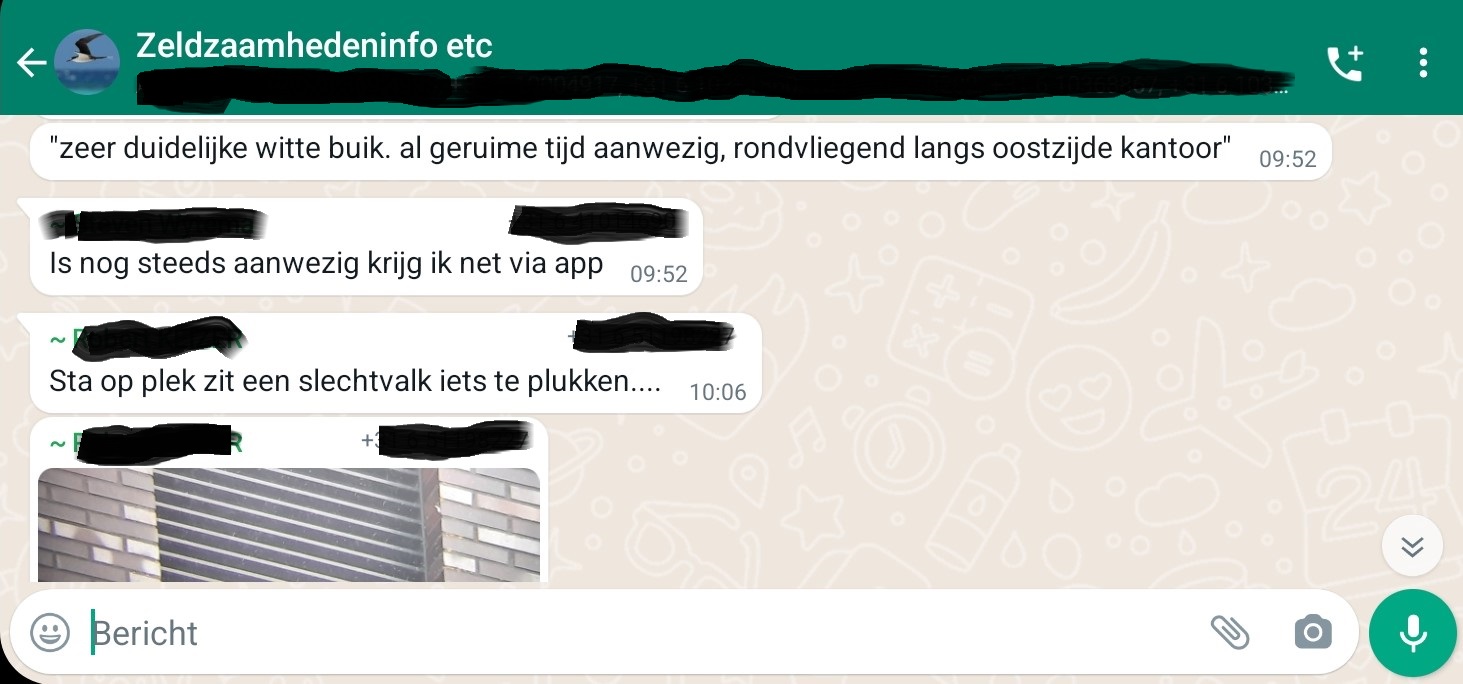 Terug naar 2023, een Alpengierzwaluw in Almere. De bijgevoegde foto laat inderdaad een Alpengierzwaluw zien en om 10:00 de melding dat de vogel nog steeds ter plaatse is. Ik besluit eerst rustig mijn BMP ronde af te maken en alvast plannen te maken voor de middag. Ik zit deze week in Vorden (GE), dus het is even kijken wat de beste route is met de trein. Maar het plan om naar Almere af te reizen kan al snel de prullenbak in, want de vogel is alweer even uit beeld met de mededeling dat een Slechtvalk ter plekke iets aan het plukken is. Men vermoed dat de Alpengierzwaluw is gegrepen door de bewuste Slechtvalk, doodzonde. Maar met de huidige influx van de soort is de kans groot op meerdere exemplaren, de vogel van Almere betrof al het 2e exemplaar in zeer korte tijd, na een langsvliegende vogel vanaf telpost Breskens (ZL).