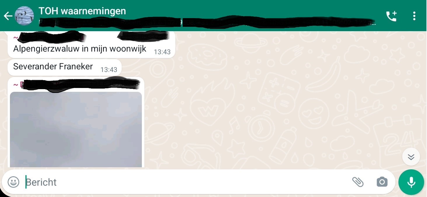 Het enthousiasme van deze waarneming strijd met de vraag/twijfel in hoeverre deze vogel ‘te doen’ is. Zal deze vogel een tijdje blijven hangen of toch snel door vliegen? Ik gok het laatste. Al snel zijn er meerdere vogelaars in Franeker om te zoeken en aanvankelijk lijkt de vogel inderdaad alweer te zijn gevlogen. Even na 14:30 is de Alpengierzwaluw plots toch weer in beeld, lijkt dus toch ter plaatse rond te hangen. Om 14:45 verschijnen enkele jaloersmakende foto’s van de vogel.