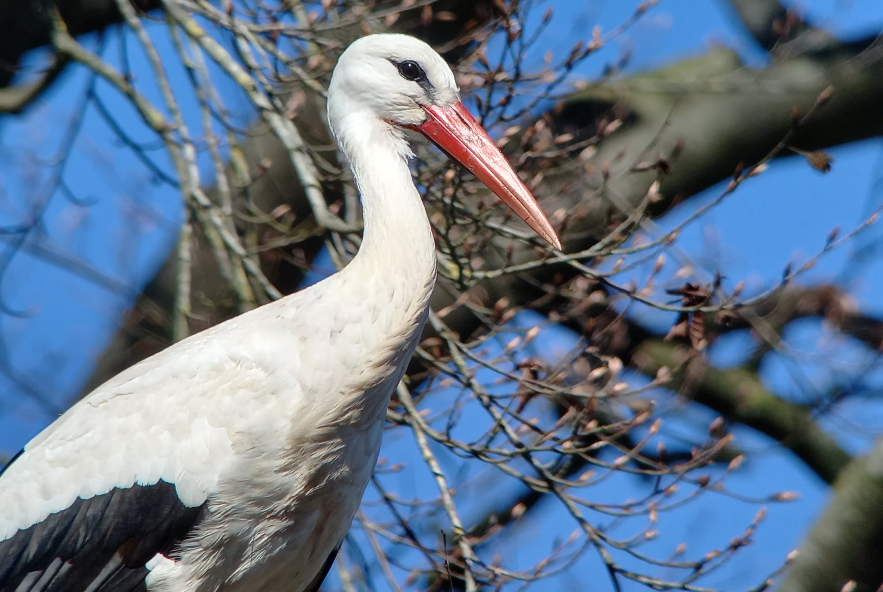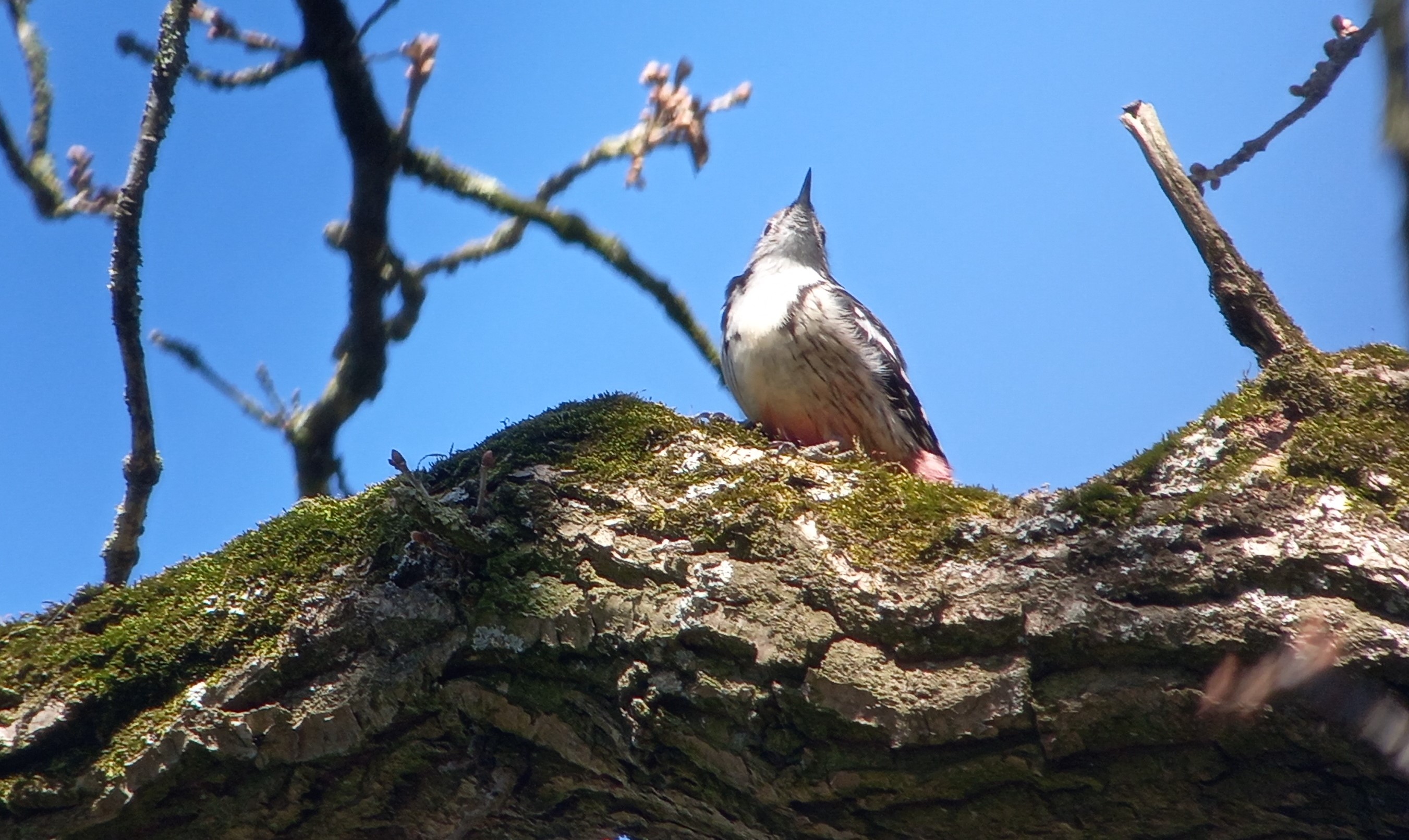 Groene Spechten schitteren door afwezigheid, vrijwel altijd heb ik op de golfbaan wel meerdere roepende vogels. Maar deze ochtend even niet, ondanks het mooie weer. Maar ik treur niet, ik hoor namelijk verderop een Middelste Bonte Specht zingen. Even later ook een 2e vogel. Pas mijn eerste waarnemingen hier van deze soort sinds 26 januari. Het duurt niet lang of ik weet één van de vogels te traceren. Zoals gewoonlijk zit deze spechtensoort hoog in de eikenbomen. Ik zet de niet al te schuwe, maar toch zeer alerte specht in mijn telescoop, en weet leuke opnames te maken. Wat een schitterende vogel. De vogel ‘gaait’ er flink op los, foerageert een beetje en wordt uiteindelijk verjaagd door een Grote Bonte Specht. Verder vermaak ik me nog even met de plaatselijke Ooievaars.