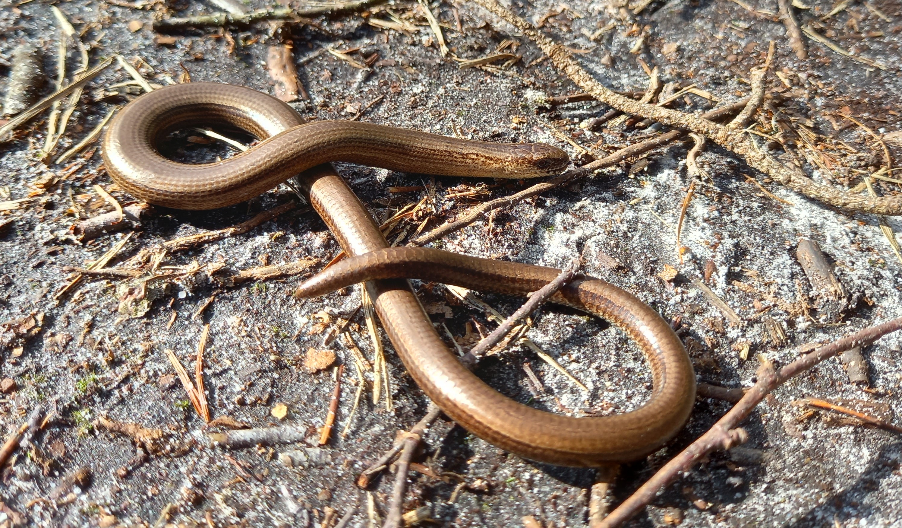 ’s Middags ga ik dieper de bossen in. Ik bezoek enkele vennetjes en heideterreinen, in de hoop op reptielen. Een Ringslang zou gezien het zonnige weer toch moeten kunnen. Of een Adder. Ik kom Heikikkers in koor tegen en een mooi aantal Levendbarende Hagedissen, maar van slangen geen spoor. Aan het einde van de middag kom ik toch nog een leuke verassing tegen. Geen slang, maar wel een soort die vaak wordt aangezien voor een slang. Een schitterende Hazelworm ligt op het zandpad te zonnen.