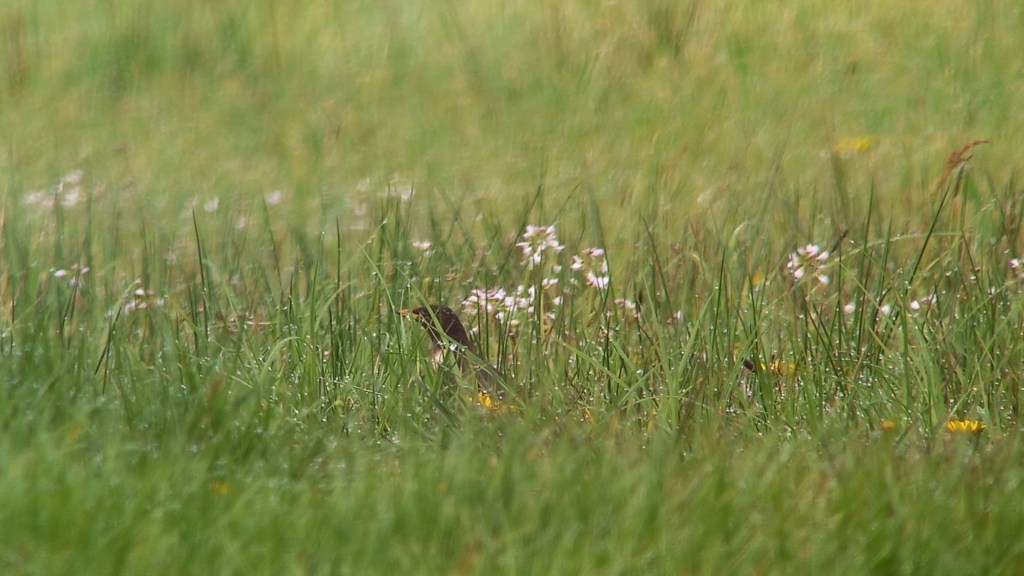 In een plasje foerageren een vijftal Groenpootruiters en een Zwarte Ruiter. Van deze prachtige steltlopers lukt het wel wat opnames te maken. Even verderop zie ik, terwijl er 3 Raven mooi laag overvliegen, net iets te laat een groepje Beflijsters. De vogels vliegen op vanuit een meidoornbosje en lijken te zijn gevlogen. Ik scan met de verrekijker en zie dan opeens iets scharrelen tussen het hoge gras. Telescoop erop, en het blijkt een prachtig mannetje Beflijster. Iets verderop een 2e vogel. Af en toe onzichtbaar, maar door de ‘tjakkende’ roep zijn ze goed te lokaliseren. Dan vliegen ze samen met Zanglijsters op en vliegen de bosjes in. Lijsters zijn over het algemeen behoorlijk schuw en dat is bij Beflijsters vaak niet anders.