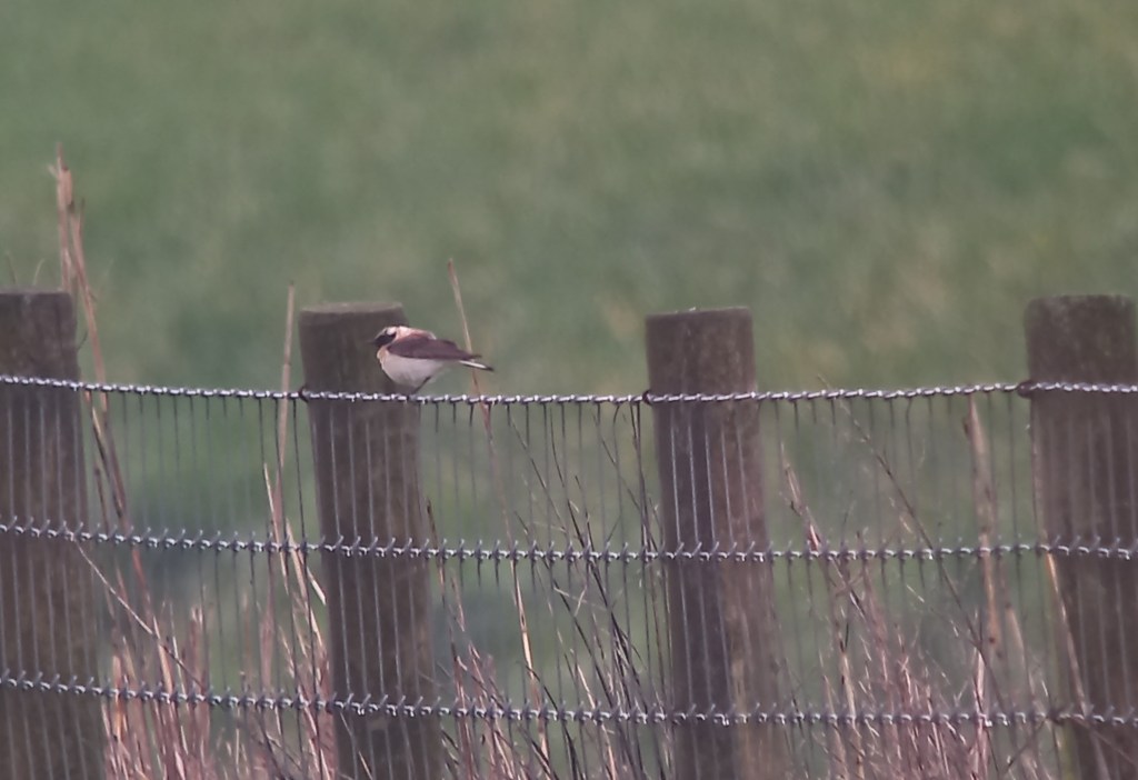 Niet veel later is het echt paniek als iemand vol overtuiging roept: “hier zit ie!”. We krijgen aanwijzingen, maar zien geen vogel. “Waar dan precies”? vogel lijkt terug te zijn op de oude plek waar deze een groot deel van de dag is gezien. Op een rij paaltjes met daarnaast een sloot. En dan opeens zit de Blonde Tapuit op de paaltjes, als vanuit het niets. Laat zich prachtig zien, hoewel op enige afstand. Vreugdekreten galmen over de waddendijk. Het was inmiddels ook opgeklaard. Kennelijk heeft de vogel ergens uit het zicht afgewacht tot het droog zou worden. De vogel is vrijwel continu in beeld foerageert actief op insecten. Prachtig foerageergedrag waar je eindeloos van kunt genieten. Om nog maar te zwijgen over het prachtige verenkleed van de vogel. Met name het zwarte masker en het warme oranje springen eruit.