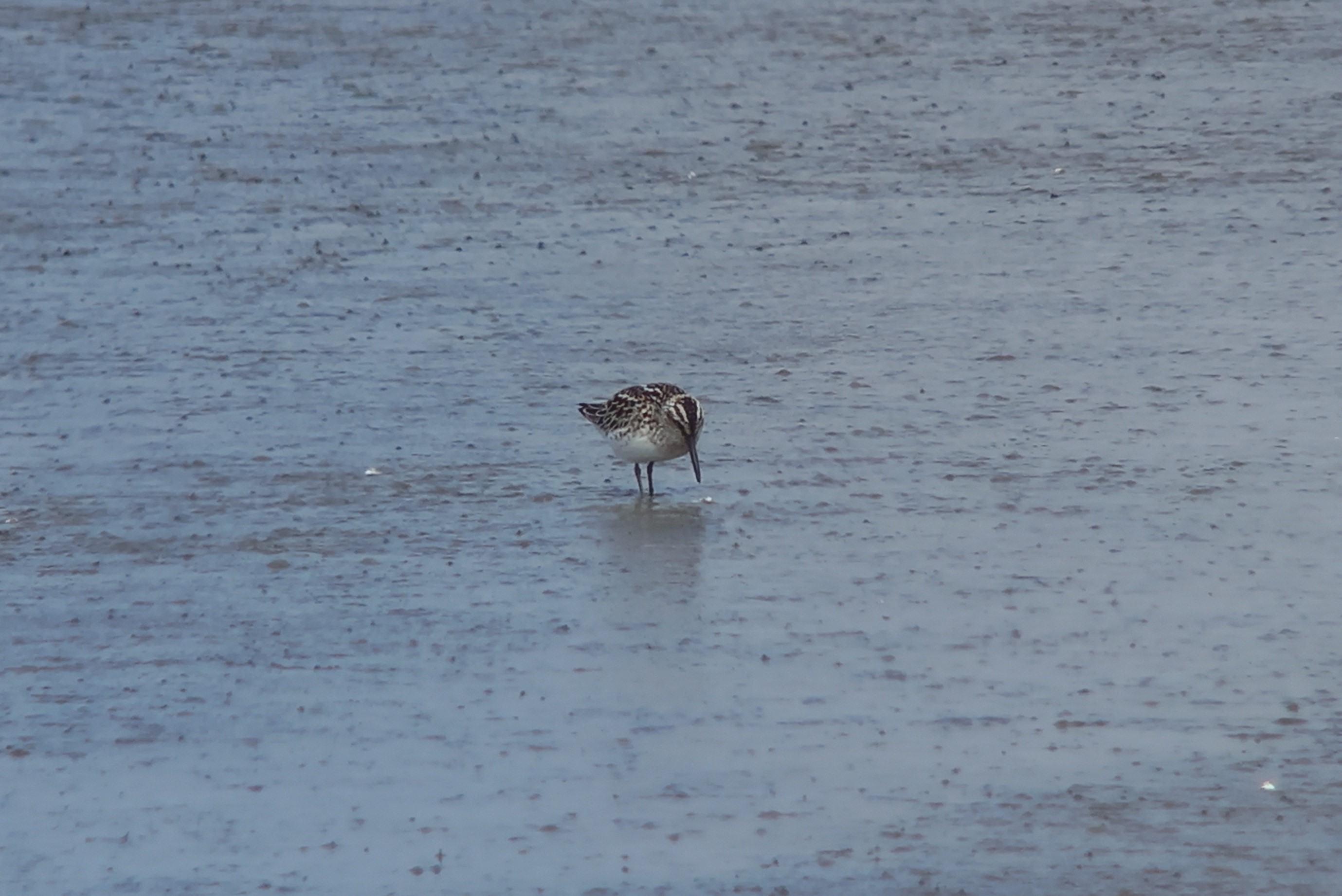 Als we aankomen bij de Bantpolder treffen we Merel en Vincent. We maken even een praatje, horen verschillende verhalen aan en klimmen snel de waddendijk op. Zoals verwacht is het direct weer genieten van de vele duizenden foeragerende steltlopers hier. Regenwulpen, tureluurs, scholeksters, bontbekplevieren, zilverplevieren, kluten, krombekstrandloper en bonte strandlopers die in grote groepen sierlijke vluchten maken boven het wad. Op de dijk tapuiten, kneuen, witte kwikstaarten, gele kwikstaarten en hoog in de lucht baltsende veldleeuweriken. We zien al snel een groepje vogelaars staan en we hebben geluk. De breedbekstrandloper zit nog steeds mooi vooraan op het wad. Nog nooit zag ik deze zeldzame strandloper zo mooi.
