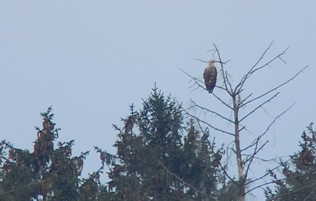 Terwijl ik bijna non-stop de lucht afzoek in de hoop op slangenarend, fiets ik weer richting het informatiecentrum. Wie weet zit er nu wel een roodhalsfuut en wellicht wat rietvogels. Bij het informatiecentrum zie ik enkele mensen wel heel erg geconcentreerd naar iets kijken, met de camera’s gericht naar de lucht. Dat kan eigenlijk maar één ding betekenen. Ik parkeer snel mijn fiets in de berm en scan de lucht af. Net ten noorden van het informatiecentrum een biddende roofvogel, slangenarend. Na vandaag al meerdere biddende buizerds te hebben gezien, is dit wel erg fijn.