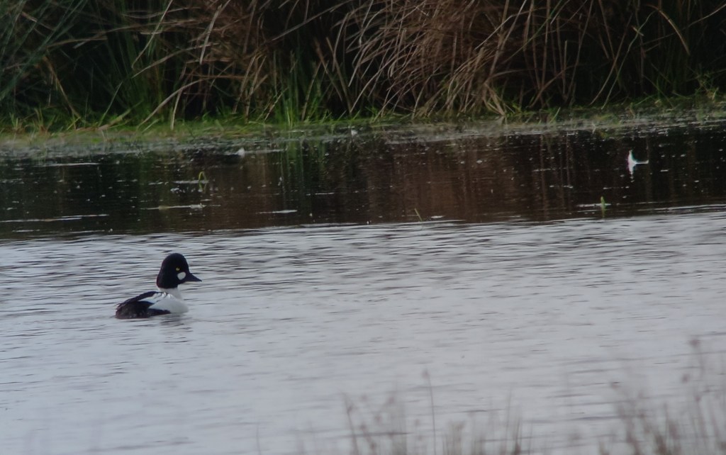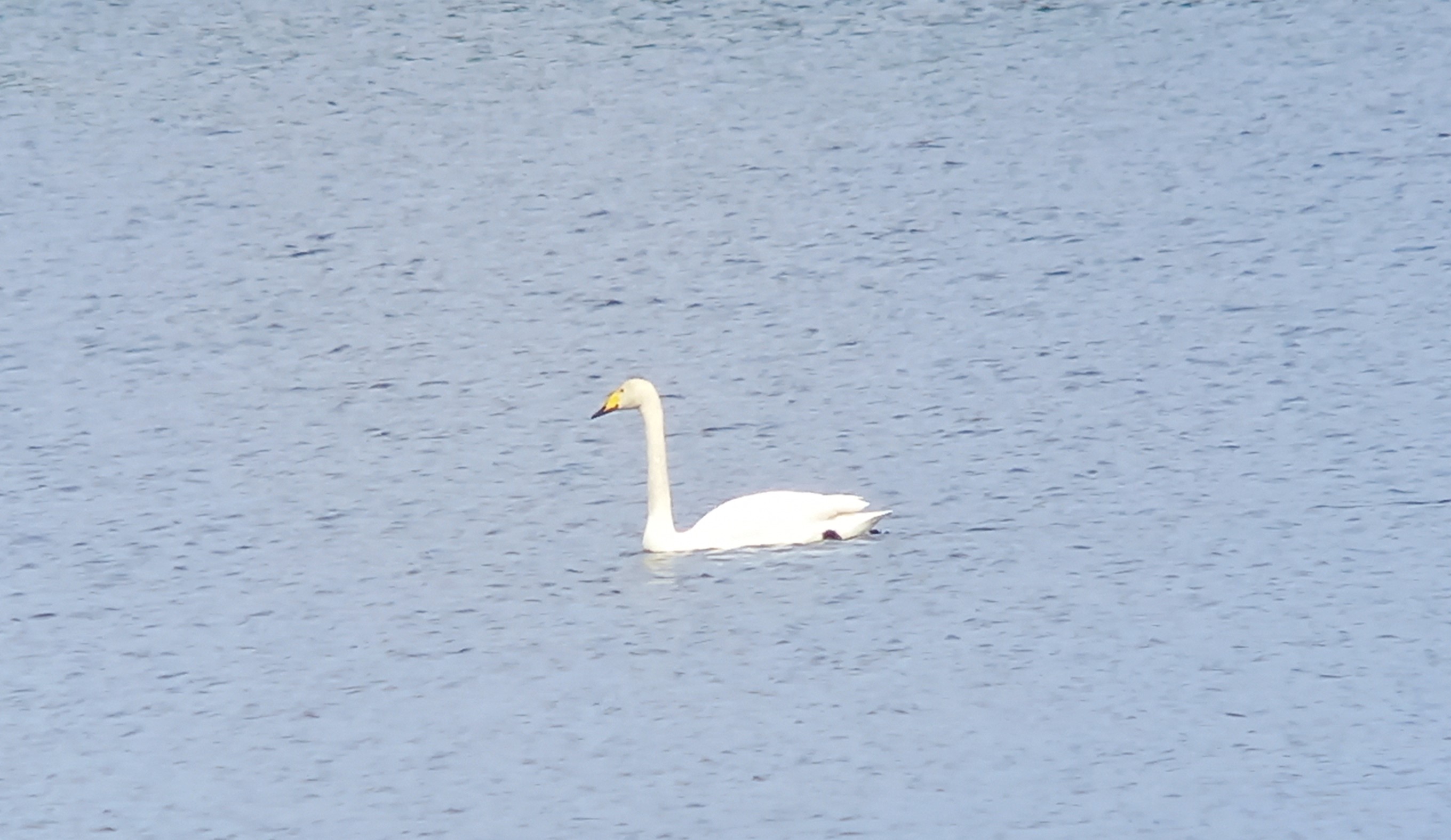 Nu het licht wordt, is het ook tijd om de telescoop op te stellen. Ik vermoed dat de wilde zwanen hier ergens verstopt zitten. Mijn vermoeden klopt, al heel snel heb ik het zwanenpaar in beeld, met 3 jongen. Eén van de oudervogels vliegt roepend op en blijft een paar grauwe ganzen achtervolgen, totdat deze het gebied verlaten, mooi om te zien. Roodhalsfuut die hier recent nog is gemeld is onvindbaar. Erg welkom is een regenwulp, die mogelijk de nacht heeft doorgebracht in het plas-dras. Bij het informatiecentrum zit een spotvogel te zingen.