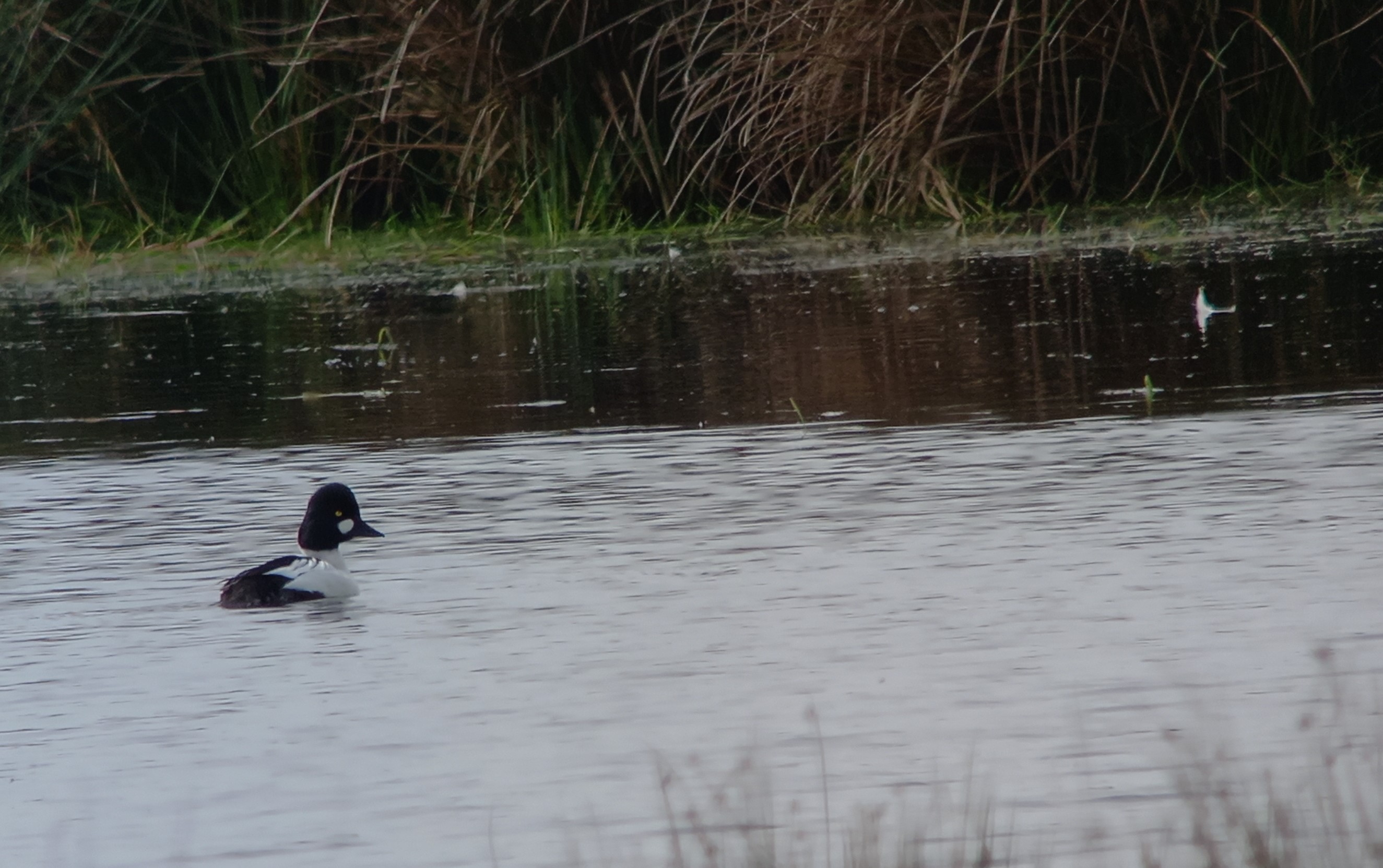 Bij het plas-dras achter het informatiecentrum is roodhalsfuut wederom onvindbaar, ik ga er vanuit dat ik deze soort niet ga zien vandaag. De wilde zwanen zitten wel een stuk dichterbij dan vanochtend. Vanuit het oosten komen er 2 sterns aangevlogen, ik ga uit van visdiefjes. Als de vogels dichterbij komen valt de roep erg op, een korte en schorre kreet. Witwangsterns!!! Door de verrekijker zie ik ook meteen de donkergrijze onderdelen in sterk contrast met witte wang en lichte ondervleugels.