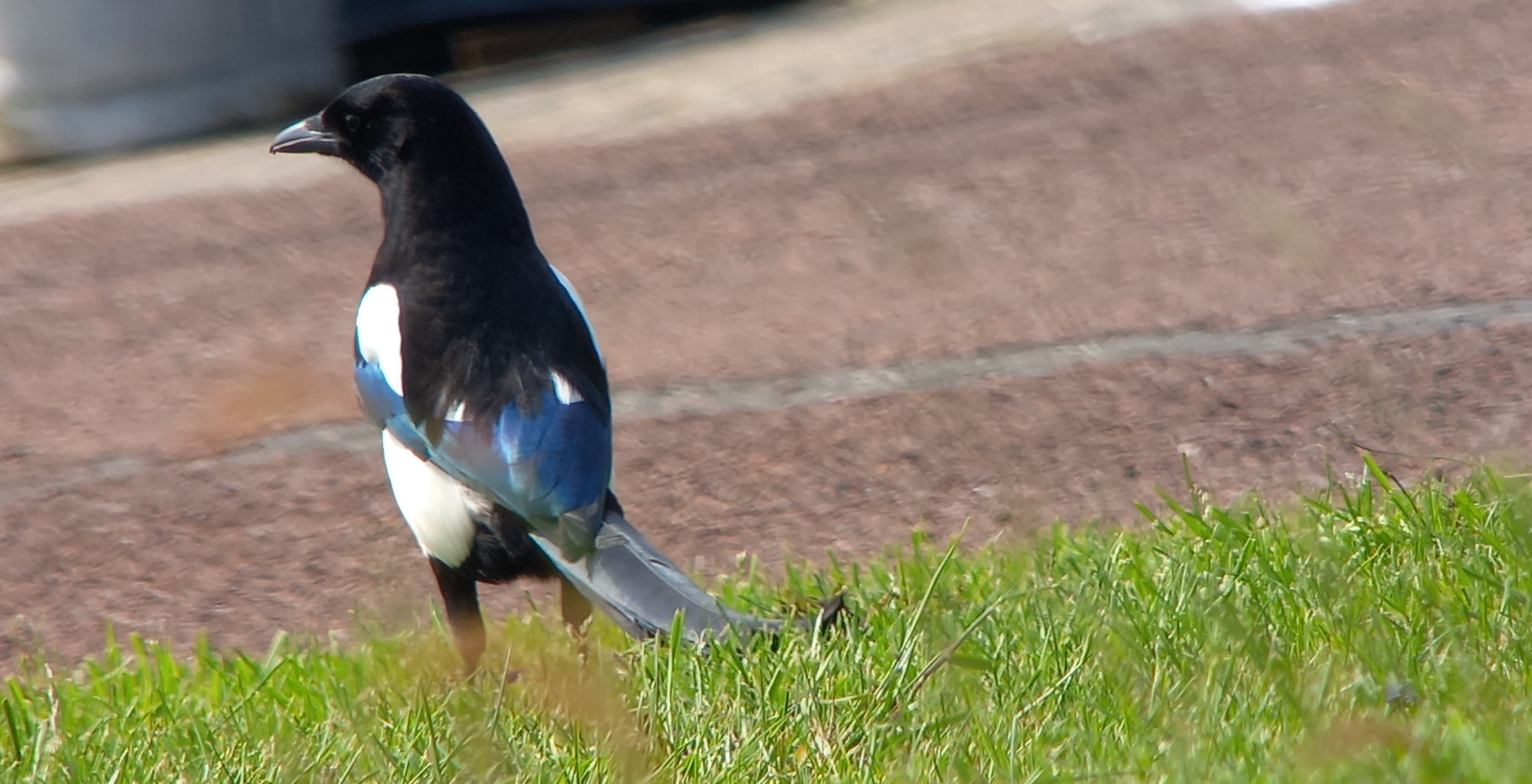 Er blijken zelfs 4 Turkse tortels te zitten, gelukkig zitten ze er nog. Turkse tortel, een algemene huis- en tuinvogel, hier zeer schaars. Zo schaars, dat je er gericht naar moet zoeken. Als je de statistieken van SOVON vogelonderzoek Nederland erop naslaat, zie je op de verspreidingskaart ook een grotendeels wit (soort ontbreekt) gebied op de grens van Friesland met Drenthe. Zie deze link: Verspreiding en trends Turkse Tortel in Nederland. Bij ekster zie je hetzelfde verspreidingspatroon (Verspreiding en trends ekster in Nederland). Verderop kom ik ook een 2e eksterpaar tegen, deze laten zich beter bekijken. Wat blijven het toch mooie vogels, vooral met zonlicht erop. Het onmiskenbare zwartwit met prachtige blauwe en groene tinten.