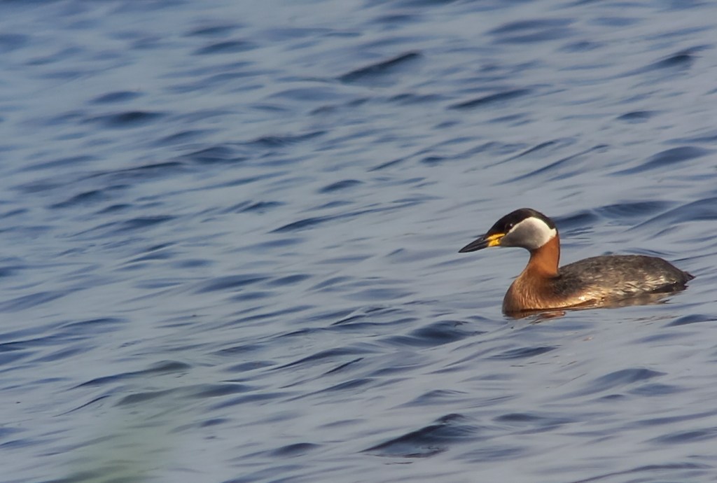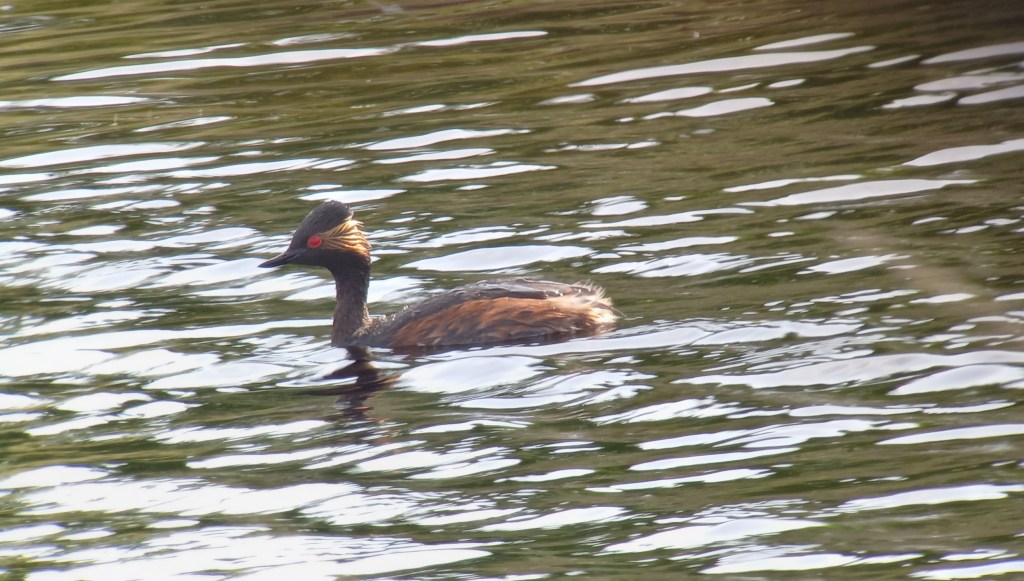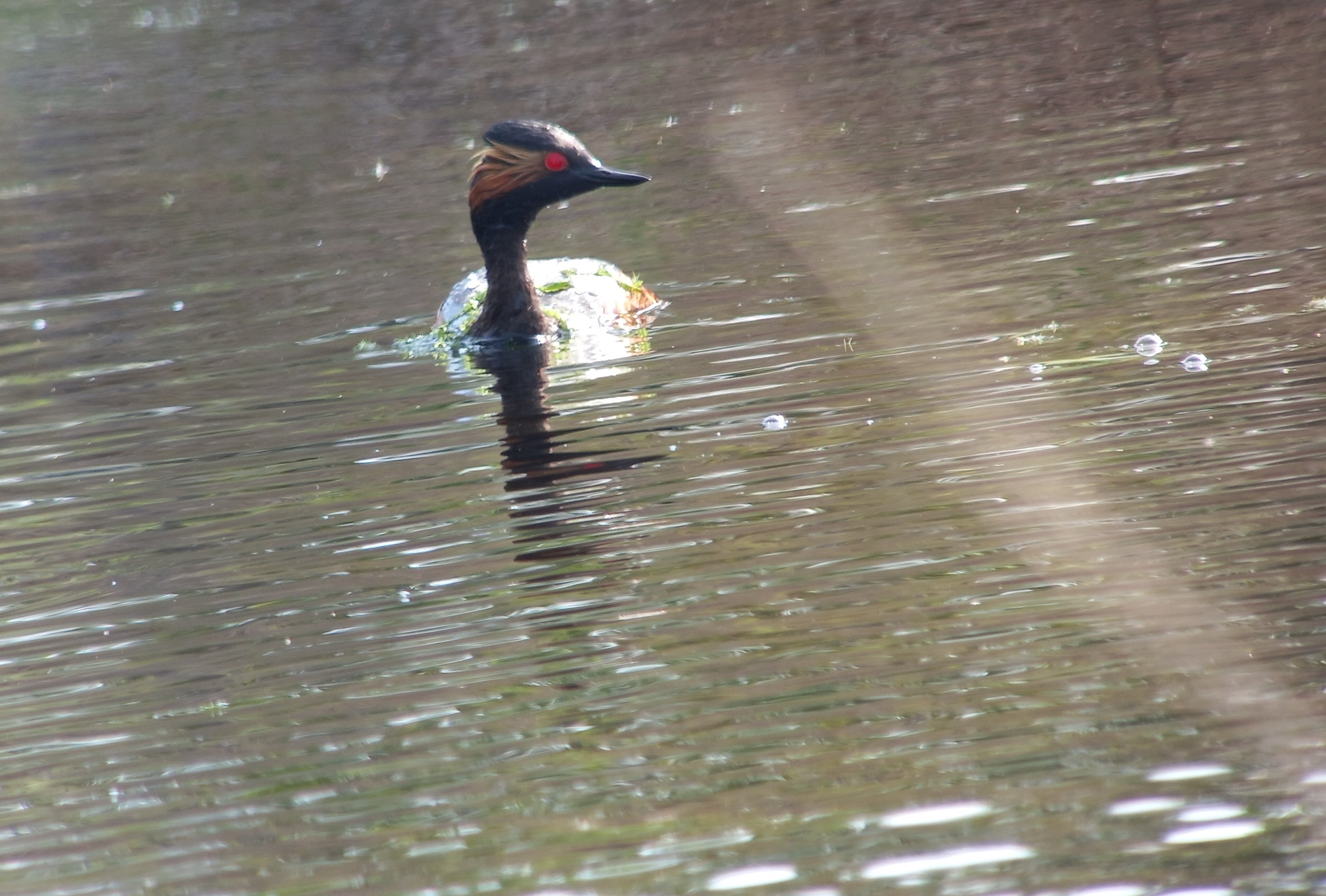 Bij de plassen van de Weperpolder valt mijn oog meteen op een vogel die vrij dichtbij zwemt. Als ik de kijker erop zet kan ik het bijna niet geloven. Een zeer fraaie adult zomerkleed roodhalsfuut schittert in de zon. Hier zit ie dus, deze voor dit gebied zeldzame soort. Het heeft zo moeten zijn. Het is pas de 2e keer dat ik een roodhalsfuut zie in het Fochteloërveen. Op de big day van maart 2021 zat er een exemplaar bij de uitkijktoren Esmeerweg. Die zat echter behoorlijk ver weg, zo mooi dichtbij als deze heb je ze niet vaak. Één van de hoogtepunten van deze fantastische vogeldag.