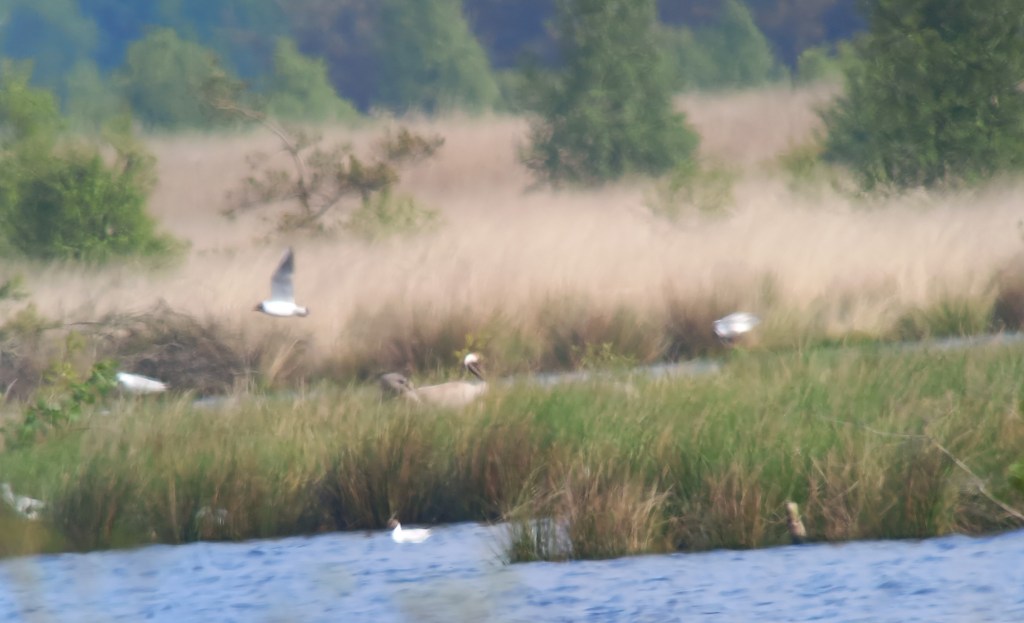 Deze soort wordt wel vaker gezien in het Fochteloërveen, maar is zeldzaam. Vorig jaar zijn er ook nog enkele vogels gezien. Dit zou weleens de beste soort van de dag kunnen zijn. Ik deel mijn waarneming via whatsapp, in de hoop dat andere vogelaars de vogels misschien kunnen oppikken. De vogels vliegen richting noord/noordwest, richting het veen. In alle hectiek, en het ging toch vrij snel, lukt het me niet om de vogels vast te leggen (ondanks pogingen de vogels in de telescoop te krijgen). Desondanks ben ik zeer blij met deze onverwachte waarneming. 3 soorten sterns in het Fochteloërveen, bijzonder.
