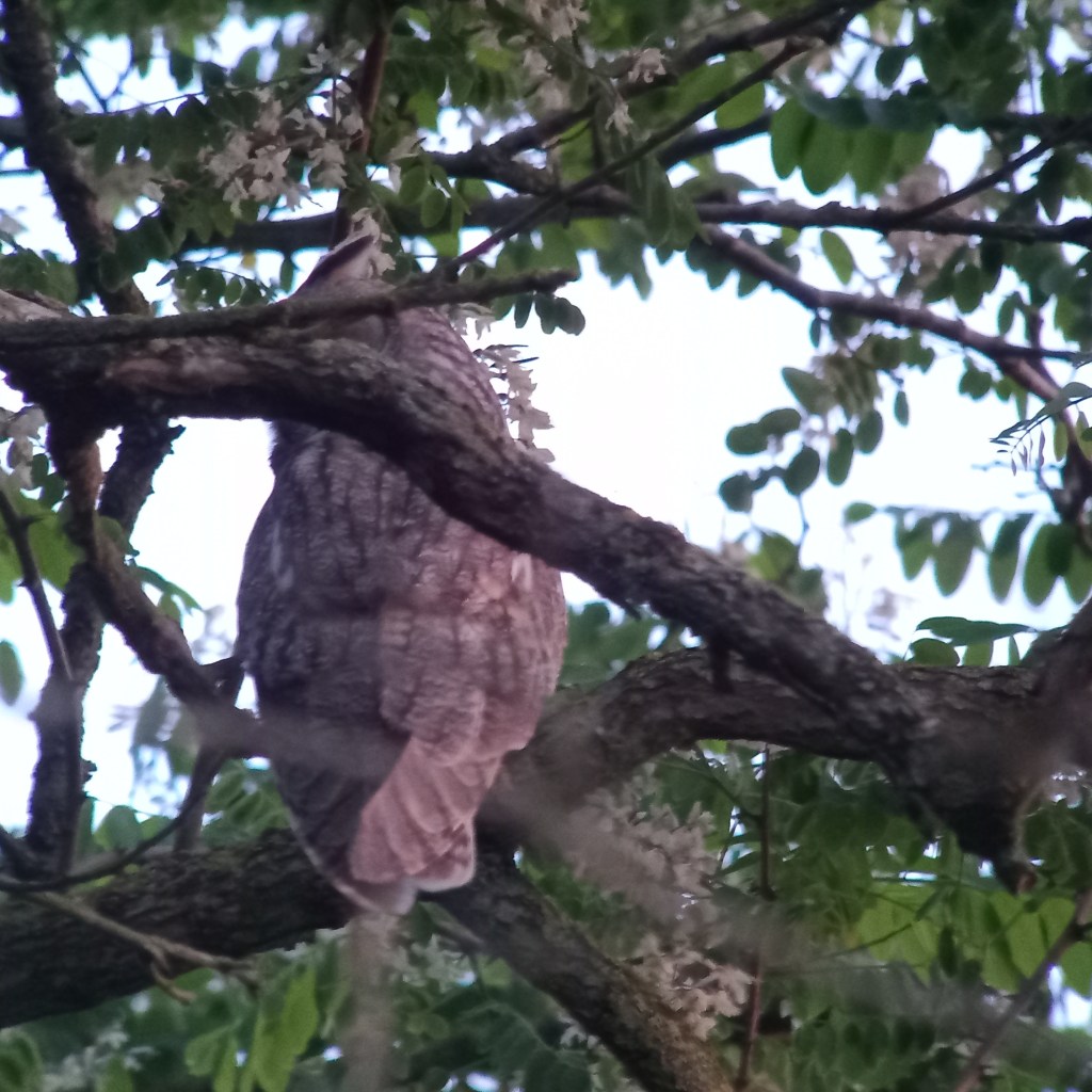 Terwijl het schemert, wordt het steeds rustiger in het luchtruim. De gierzwaluwen vliegen hun nestlocaties binnen of ze gaan hoog op de wieken om te slapen (gierzwaluwen leven bijna uitsluitend in de lucht, ook slapend). Een handjevol gierzwaluwen zie ik nog vliegen als het donker begint te worden. Een stukje verderop begint een andere soort actief te worden, ransuil. Meerdere juveniele vogels roepen vanuit een tuin. De vorige keer hoorde ik hier ook ransuilen. Ik loop richting de tuin in de hoop dat ik ze kan zien. Al snel zie ik de donkere schim van een ransuil zitten op een tak. Het blijkt een volwassen vogel. In de nabijheid vliegen/springen de juveniele vogels op een speelse manier van tak naar tak. Vandaar ook de benaming takkeling voor juveniele uilen. Takkelingen kunnen slechts hele kleine stukjes vliegen, van tak tot tak.